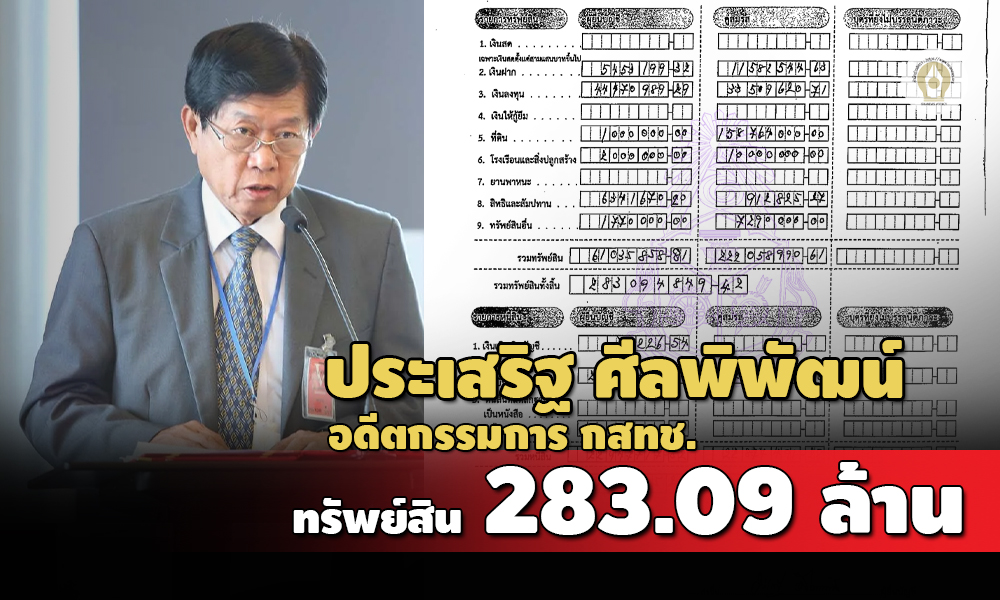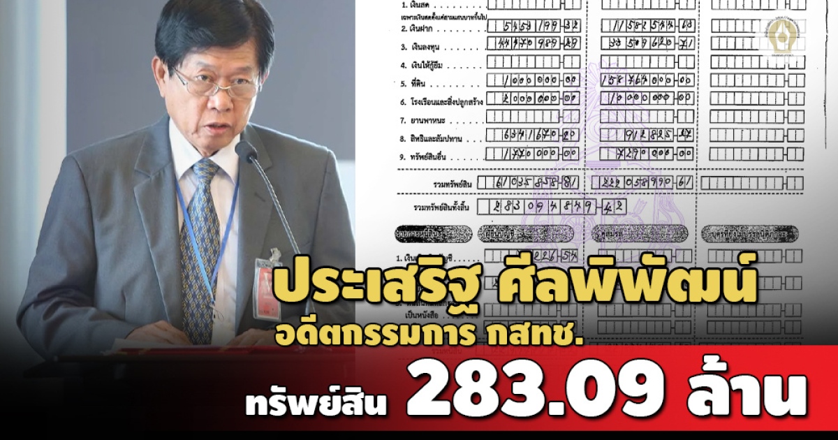 ทรัพย์สิน 283 ล้านบาท 'ประเสริฐ ศีลพิพัฒน์' พ้นบอร์ด กสทช. เงินฝาก 13 บัญชี 17.03 ล้านบาท เงินลงทุน 13 รายการ 77.98 ล้านบาท ที่ดิน 14 แปลง 159.76 ล้านบาท บ้าน 2 หลัง 12 ล้านบาท