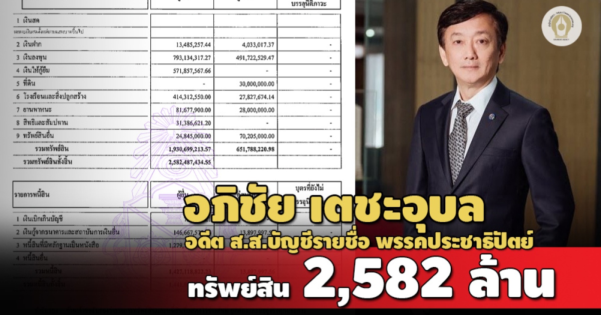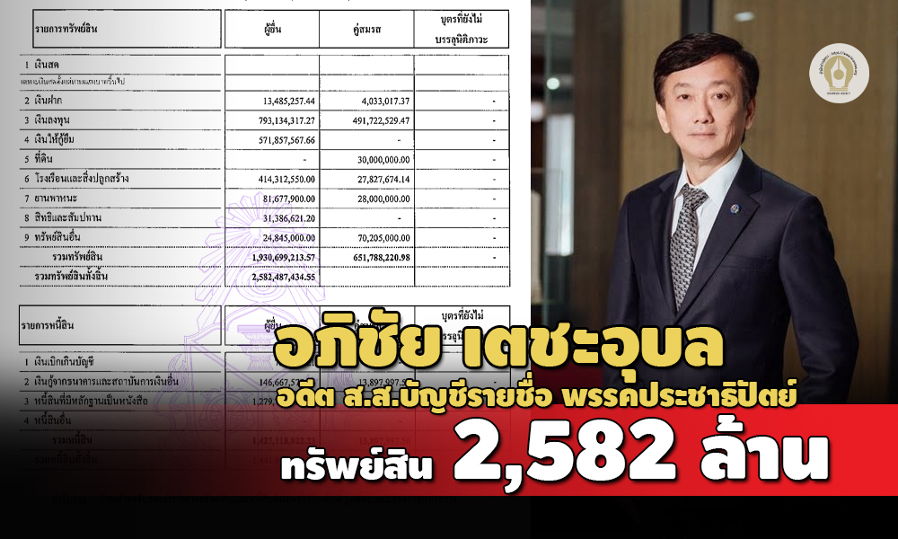ทรัพย์สิน 2,582 ล้านบาท ‘อภิชัย เตชะอุบล’พ้น ส.ส.ปชป. ย้ายร่วมงาน พปชร. ปล่อยกู้บริษัทบนเกาะบริติชเวอร์จิ้น – ลอนดอน 407 ล้านบาท ขณะที่รายการหนี้สิน พบกู้ยืมเงินบริษัทฮ่องกง 60 ล้านบาท มี ROLLS-ROYCE 3 คัน ห้องชุดย่านบางรัก 414 ล้านบาท