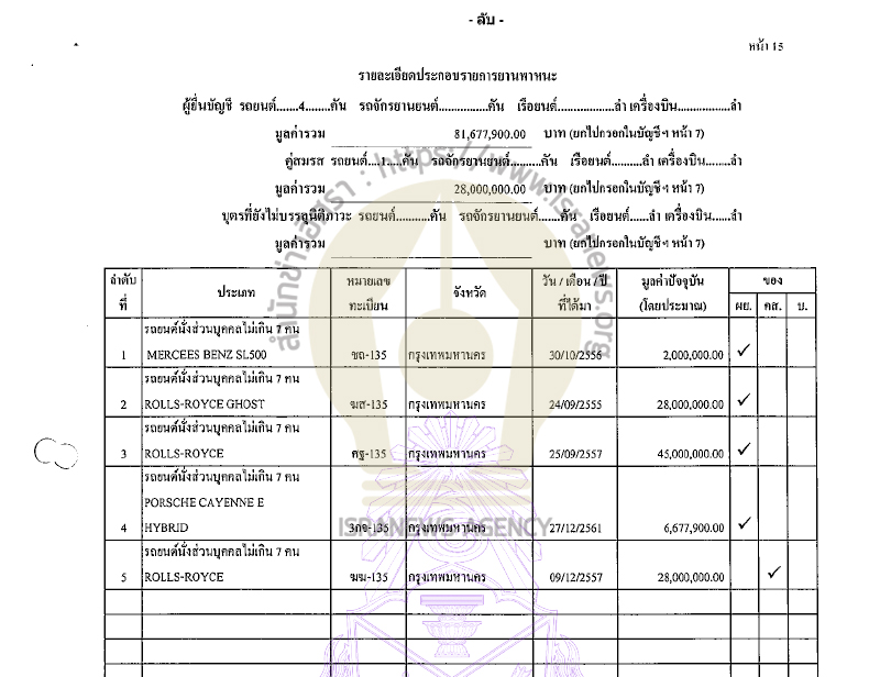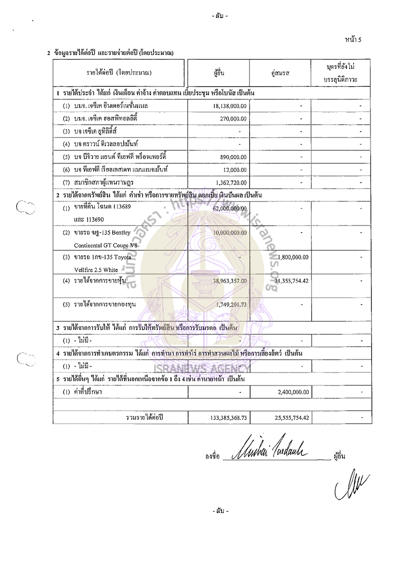 คู่สมรส แจ้งมีรายได้ต่อปี 25,555,754.42 บาท จากขายรถ Toyota Vellfire 2.5 White 1,800,000 บาท ขายหุ้น 21,355,754.42 บาท ค่าที่ปรึกษา 2,400,000 บาท