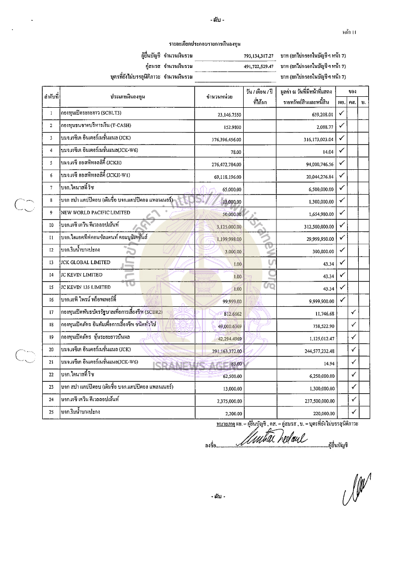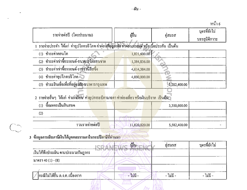 แจ้งมีรายจ่าย 11,820,820 บาท จากค่าคอนโด 1,821,600 บทา เช่าซื้อรถยนต์ (ธนาคารไทยธนชาต) 1,384,836 บาท เช่าซื้อรถยนต์ (ราชธานีลีสซิ่ง) 4,614,384 บาท ค่าอุปโภคบริโภค 4,000,000 บาท