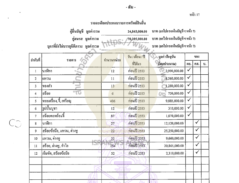 ขณะที่คู่สมรส มีนาฬิกา 27 เรือน สร้อยข้อมือ แหวน ต่างหู 22 รายการ แหวน ต่างหู 32 รายการ สร้อย ต่างหู กำไล 254 รายการ เข็มขัด สร้อยข้อมือ 52 รายการ