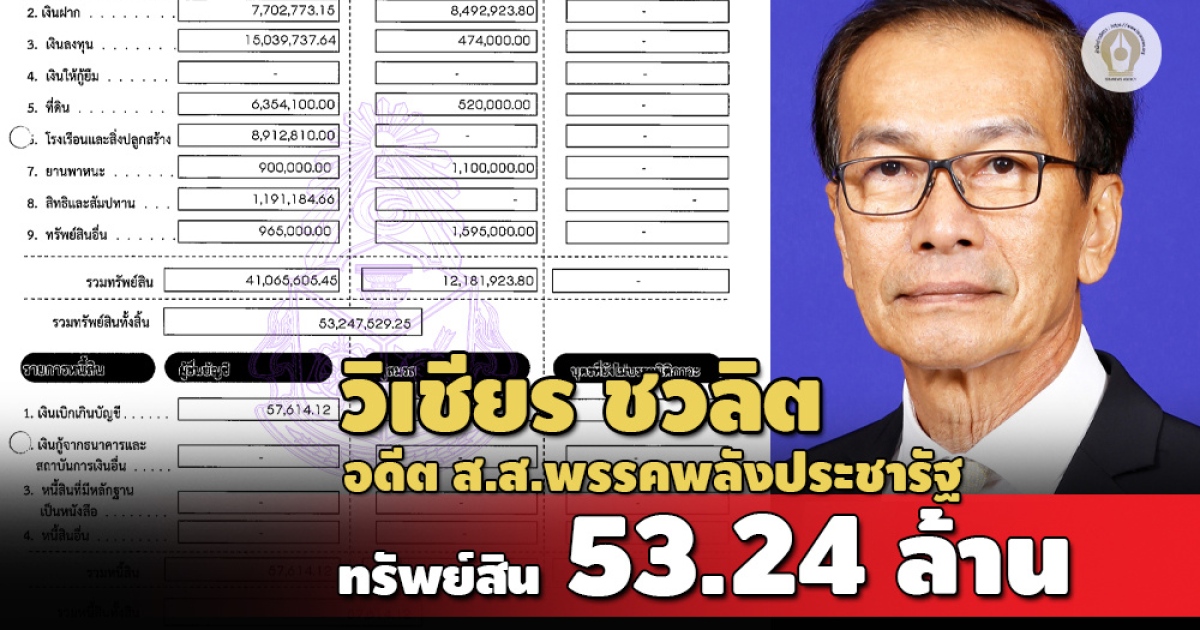 ทรัพย์สิน 53.24 ล้านบาท 'วิเชียร ชวลิต'พ้น ส.ส.พปชร. ก่อนย้ายร่วมงานพรรคสร้างอนาคตไทย เงินฝาก 21 บัญชี 16.19 ล้านบาท เงินลงทุน 14 รายการ 15.51 ล้านบาท ที่ดิน 4 แปลง บ้าน 2 หลัง 15.78 ล้านบาท