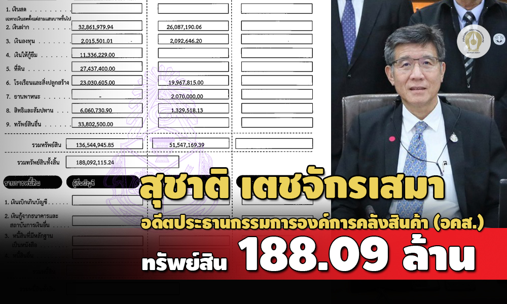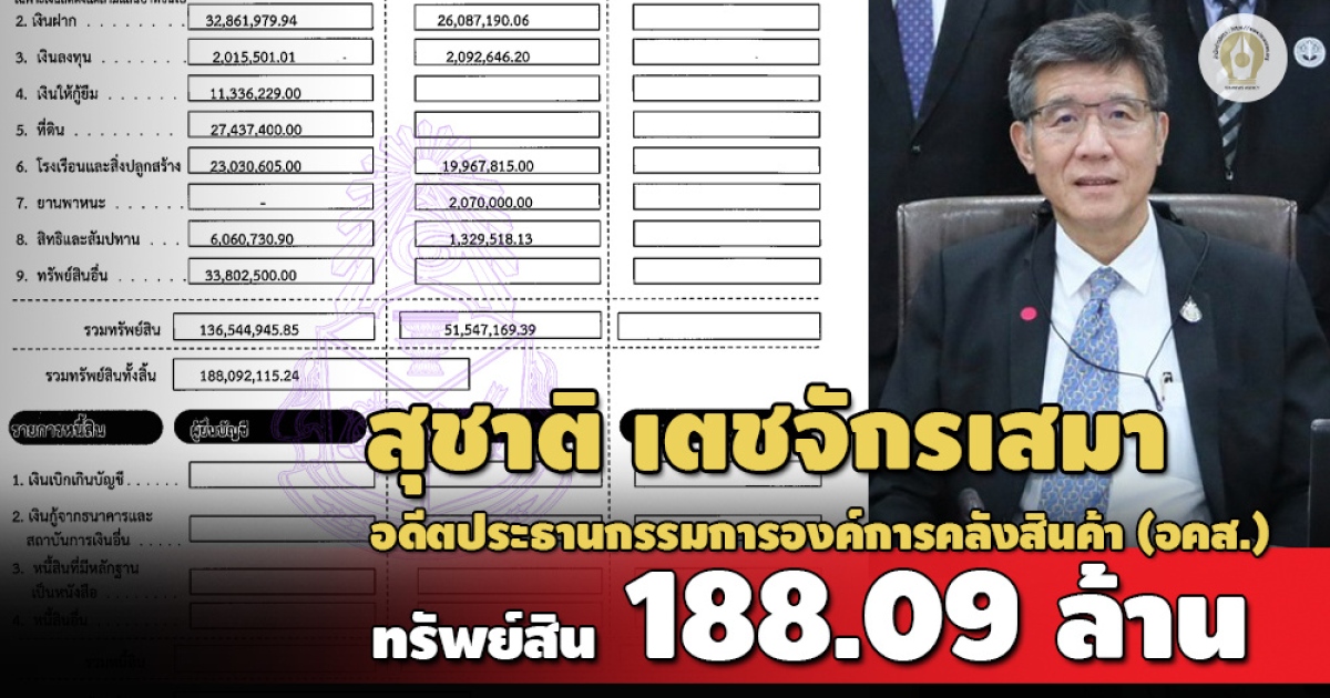 ทรัพย์สิน 188.09 ล้านบาท 'สุชาติ เตชจักรเสมา' พ้นเก้าอี้ประธานบอร์ด อคส. เงินฝาก 46 บัญชี 59.94 ล้านบาท ปล่อยกู้ลูกหนี้ 2 คน 11.33 ล้านบาท มีที่ดิน 13 แปลง 27.43 ล้านบาท บ้าน-ห้องชุด 10 หลัง 42.99 ล้านบาท มีปาเต๊ะ 4 เรือน โรเล็กซ์ 7 เรือน 9.22 ล้านบาท พระเครื่อง 6 องค์ 14 ล้านบาท
