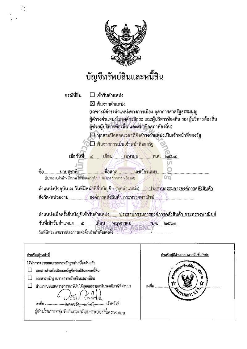 ผู้สื่อข่าวรายงานว่า เมื่อวันที่ 22 ก.ค.2565 สำนักงานคณะกรรมการป้องกันและปราบปรามการทุจริตแห่งชาติ (ป.ป.ช.) เปิดเผยบัญชีทรัพย์สินและหนี้สินและเอกสารประกอบของผู้ดำรงตำแหน่งระดับสูง รายของ นายสุชาติ เตชจักรเสมา กรณี พ้นจากตำแหน่ง ประธานกรรมการองค์การคลังสินค้า (อคส.) เมื่อวันที่ 4 เม.ย.2565