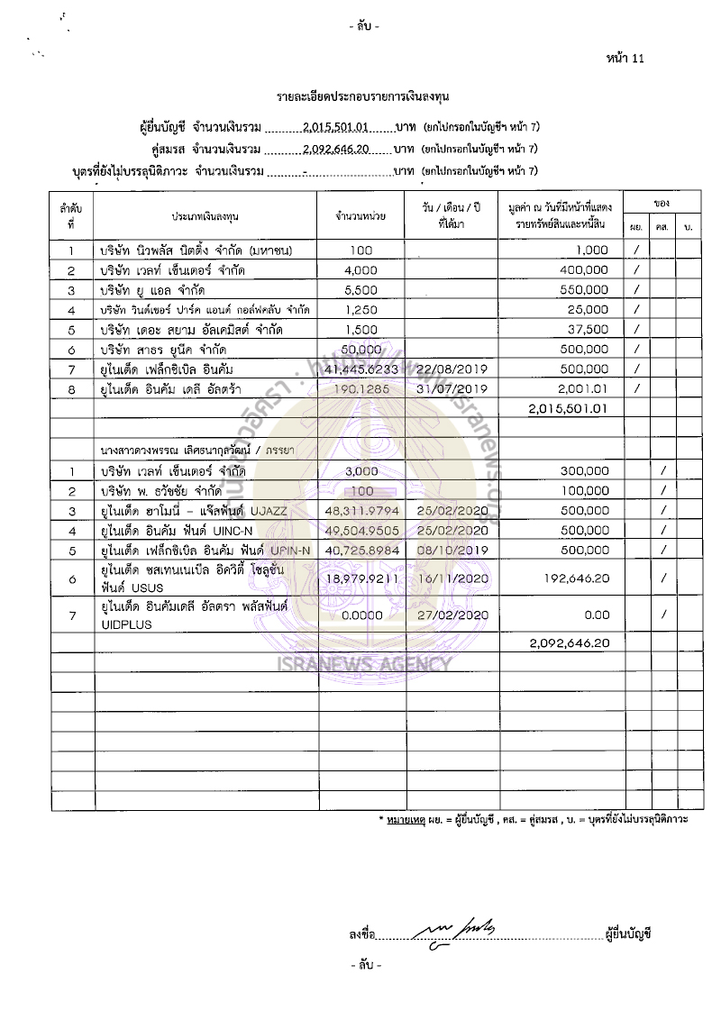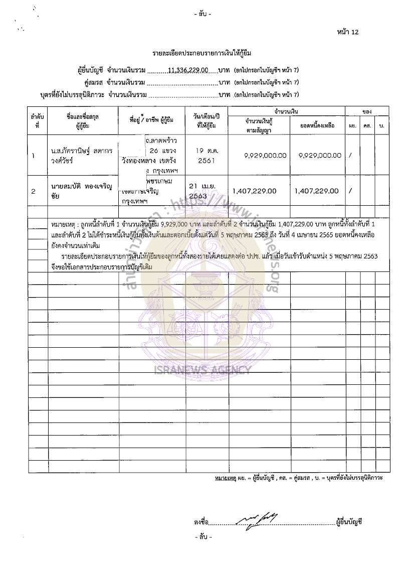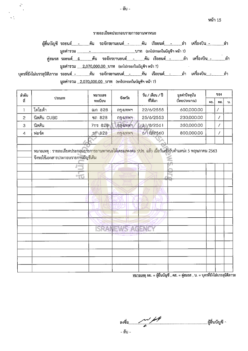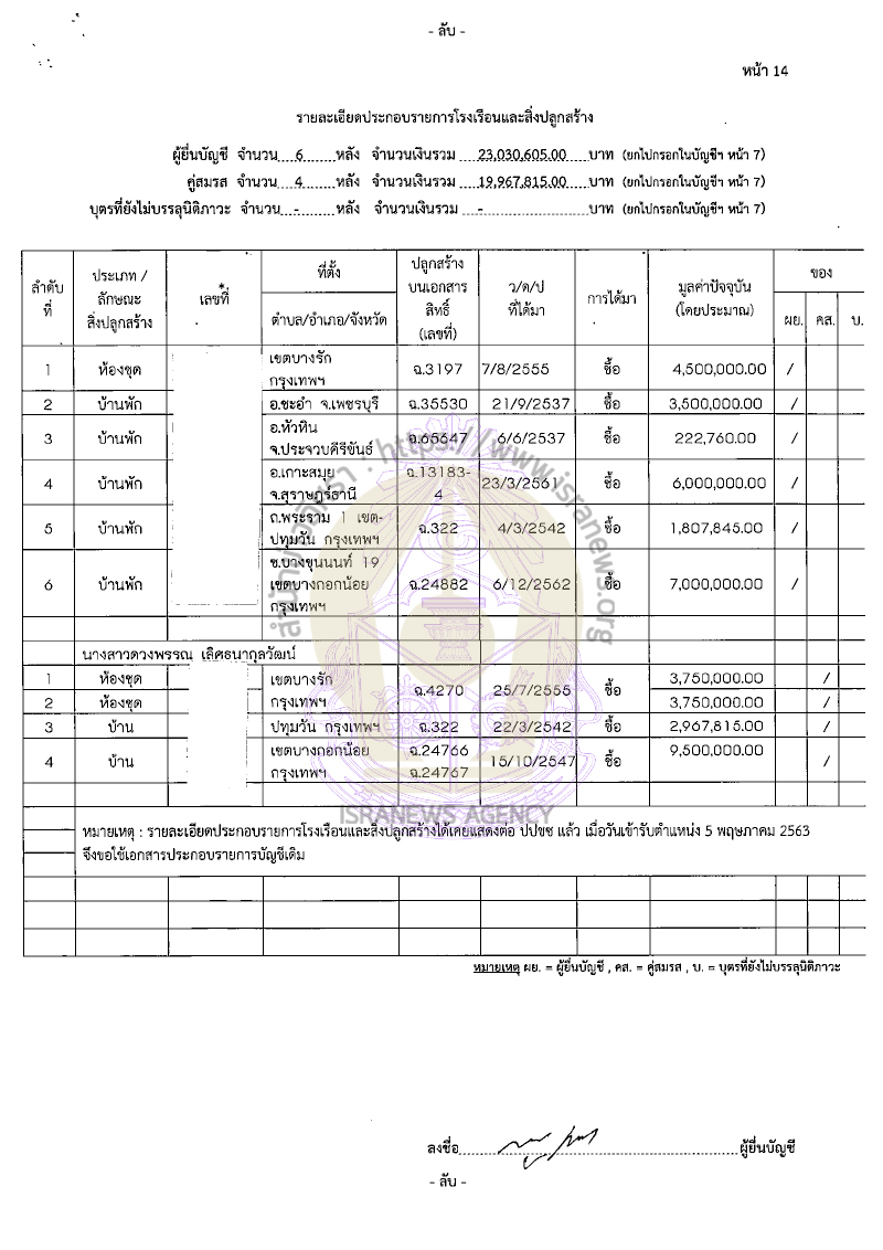 แจ้งมีรายจ่าย 973,766.30 บาท จากคอนโดเกษมสันต์ 70,642 บาท คอนโดสีลม 107,067 บาท อุปโภคบริโภค 600,000 บาท เบี้ยประกันชีวิต เอไอเอ 144,057.30 บาท เงินบริจาค 52,000 บาท