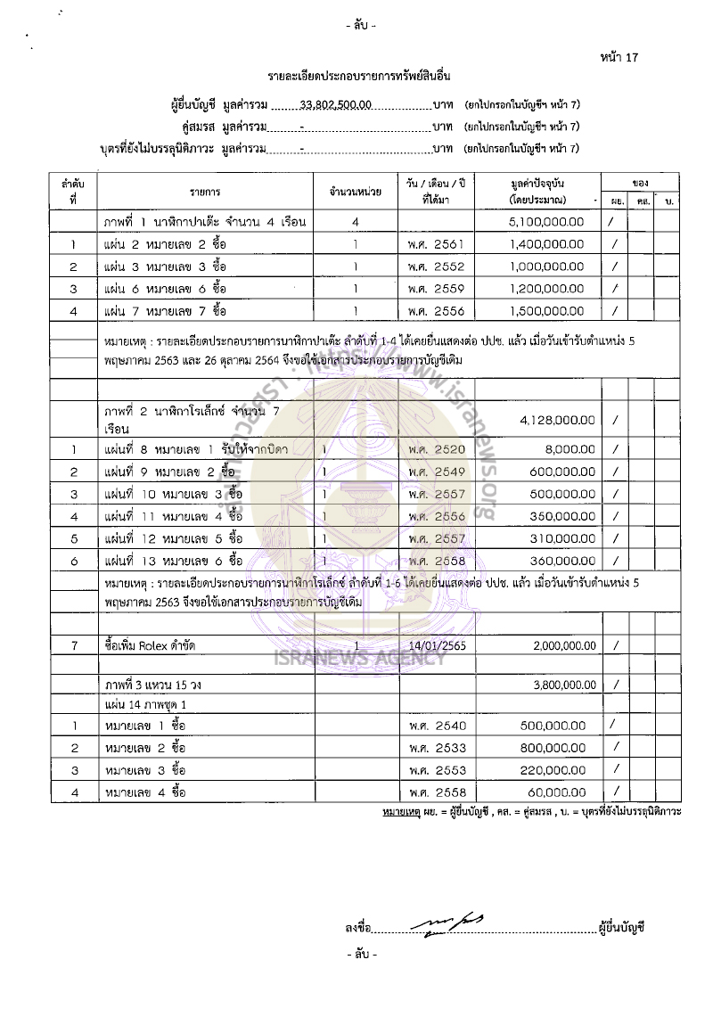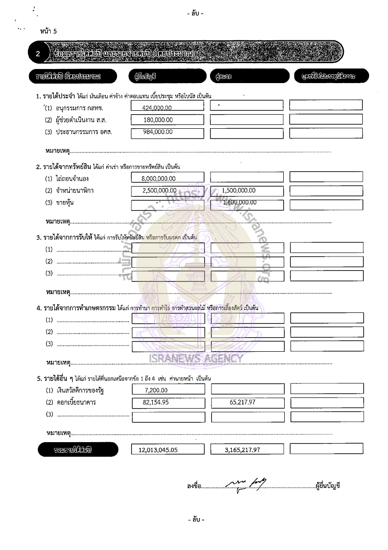 คู่สมรส แจ้งมีรายได้ต่อปี 3,165,217.97 บาท จากจำหน่ายนาฬิกา 1,500,000 บาท ขายหุ้น 1,600,000 บาท ดอกเบี้ยธนาคาร 65,217.97 บาท