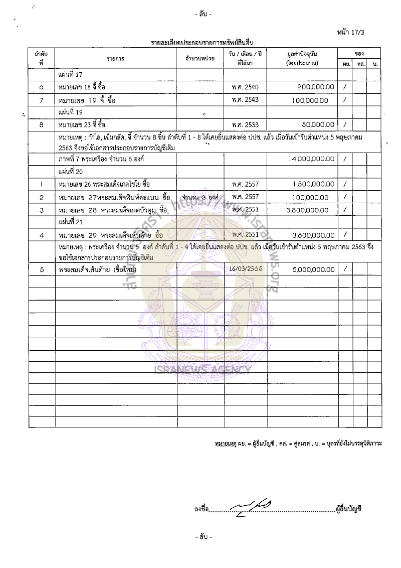 นอกจากนั้นยังแจ้งมี พระเครื่อง 6 องค์ 14,000,000 บาท อาทิ พระสมเด็จเกตไชโย พระสมเด็จพิมพ์คะแนน พระสมเด็จเกตบัวตูม พระสมเด็จเส้นด้าย และแจ้งเช่าพระใหม่ เมื่อวันที่ 16 มี.ค.2565 จำนวน 5,000,000 บาท เป็นพระสมเด็จเส้นด้ายอีก 1 องค์