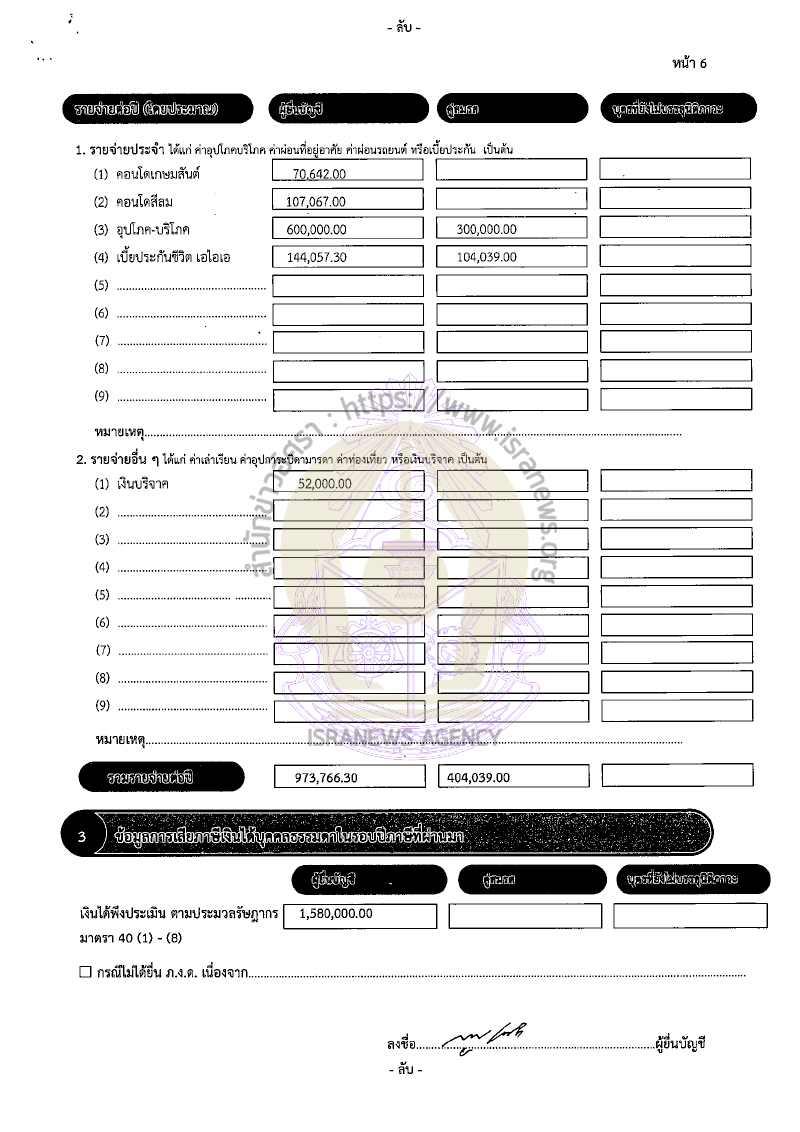 แจ้งมีรายจ่าย 404,039 บาท จากอุปโภคบริโภค 300,000 บาท เบี้ยประกันชีวิต เอไอเอ 104,039 บาท