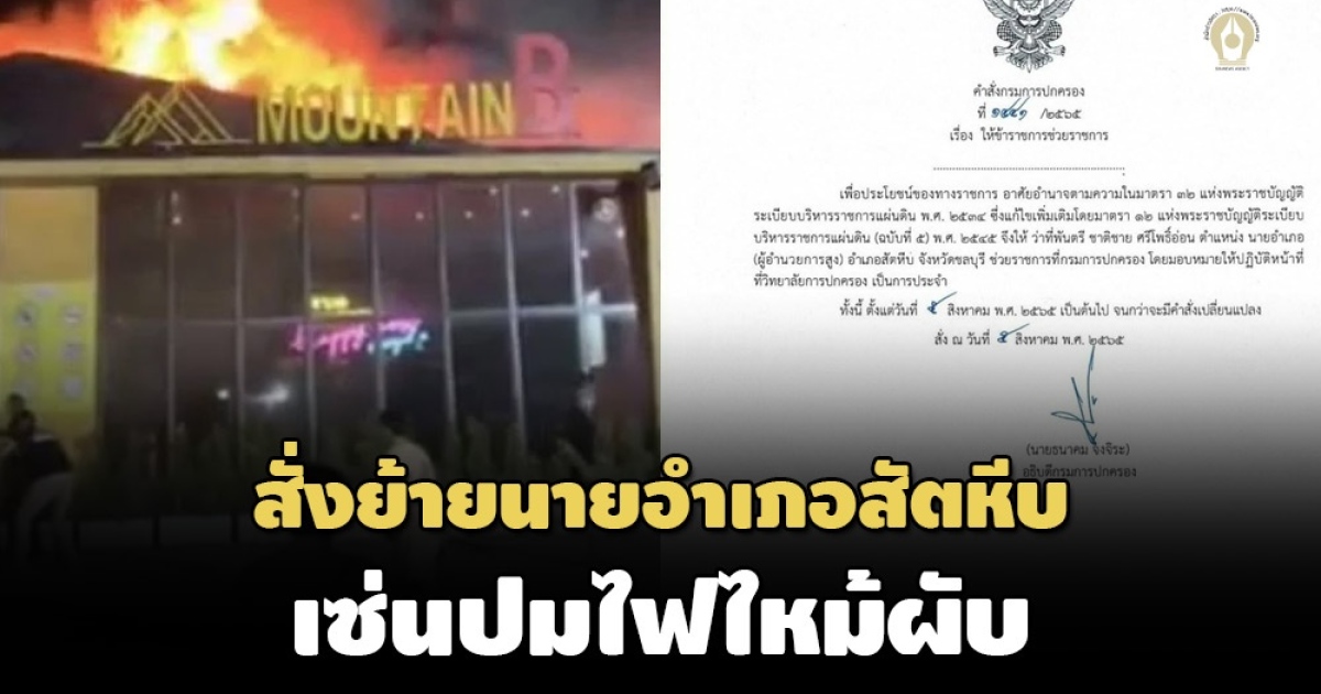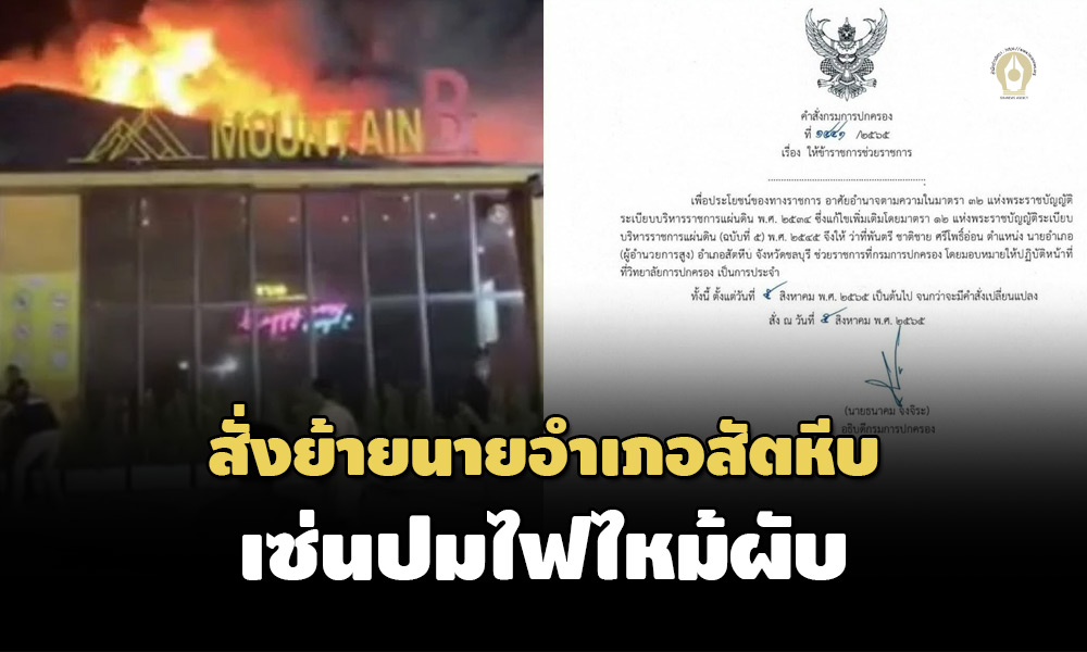 สั่งย้ายนายอำเภอสัตหีบ จ.ชลบุรี ไปช่วยราชการที่วิทยาลัยการปกครองตั้งแต่ 5 ส.ค. เป็นต้นไป เซ่นปมไฟไหม้เมาน์เทน บีผับ ทำให้มีผู้เสียชีวิตกว่า 10 ราย