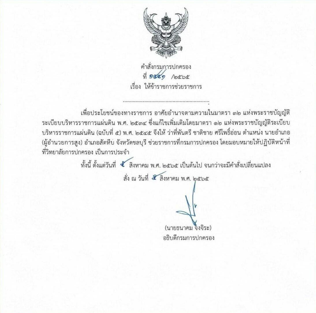 ล่าสุด กรมการปกครองมีคำสั่งย้าย ว่าที่พันตรี ชาติชาย ศรีโพธิ์อ่อน นายอำเภอสัตหีบ ไปช่วยราชการที่กรมการปกครอง โดยได้ระบุข้อความว่า