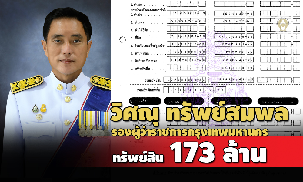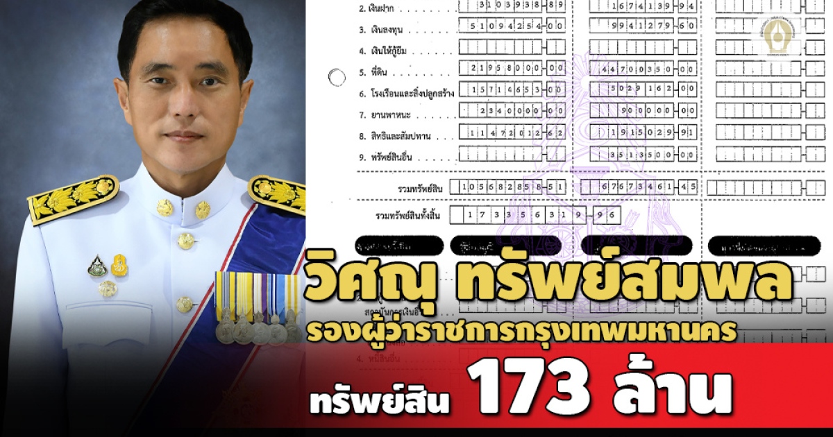 ทรัพย์สิน 173.35 ล้านบาท 'วิศณุ ทรัพย์สมพล' นั่งรองผู้ว่าฯ กทม. เงินลงทุน 21 รายการ 61.03 ล้านบาท หนี้สิน 31.71 ล. ภรรยามีสินทรัพย์ดิจิทัล 2.39 ล้านบาท - ปี 61 รับมรดกที่ดินปทุมธานี 37.58 ล้านบาท
