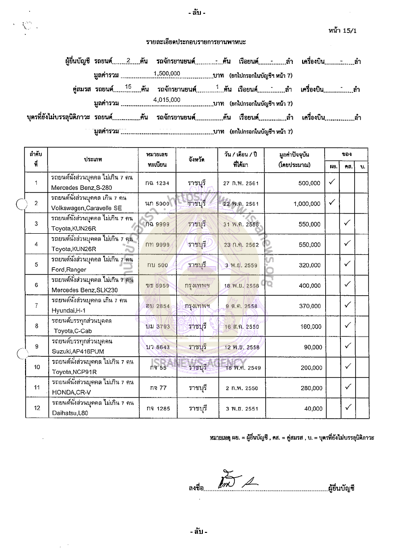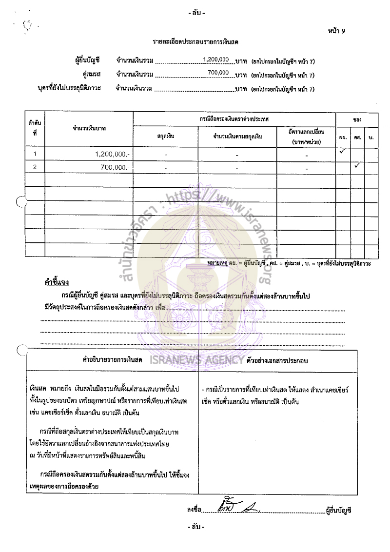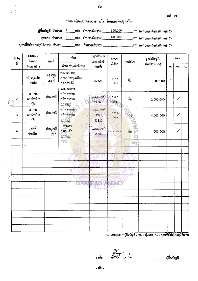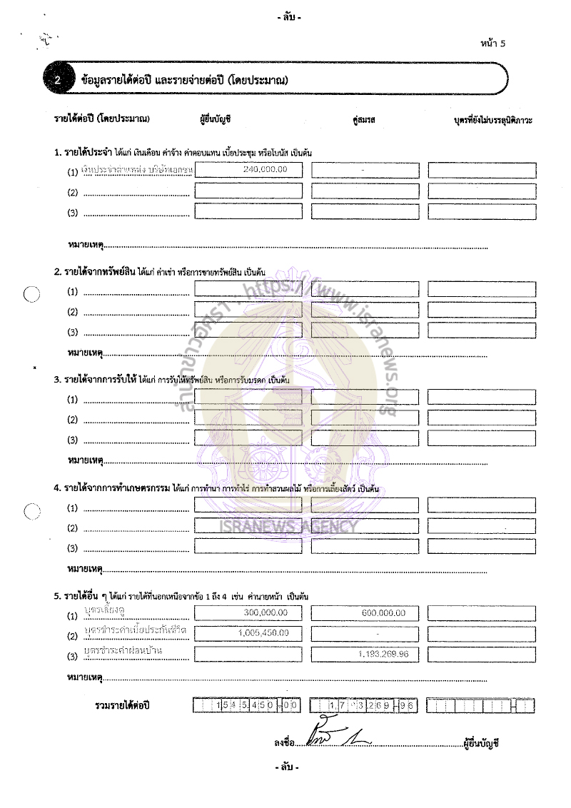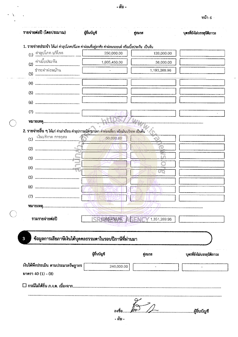 แจ้งมีรายจ่าย 1,305,450 บาท จากค่าอุปโภค บริโภค 250,000 บาท ค่าเบี้ยประกัน 1,005,450 บาท เงินบริจาค การกุศล 50,000 บาท