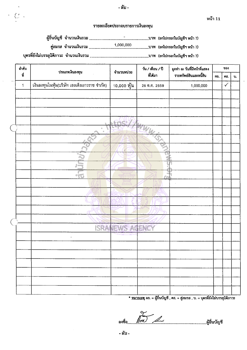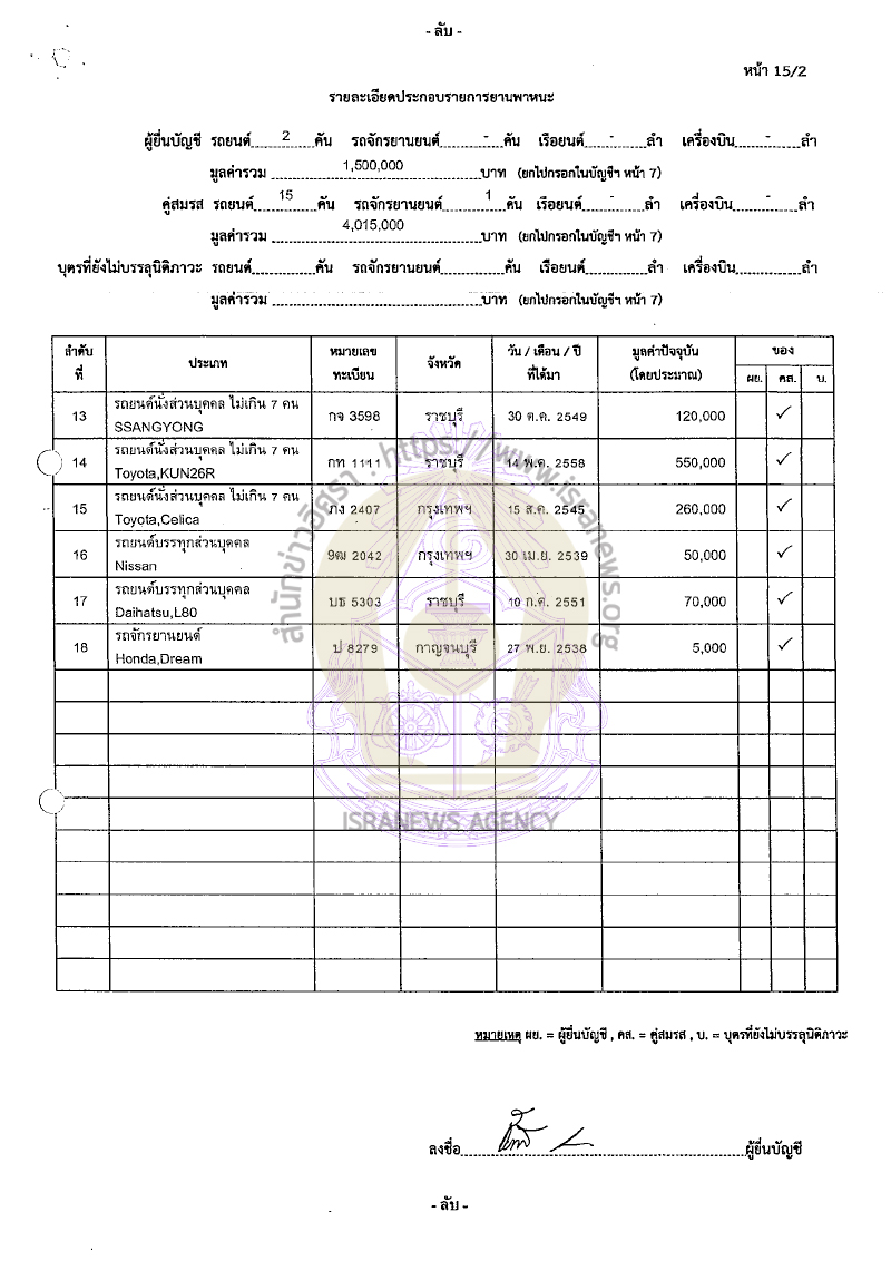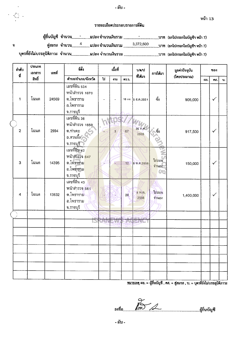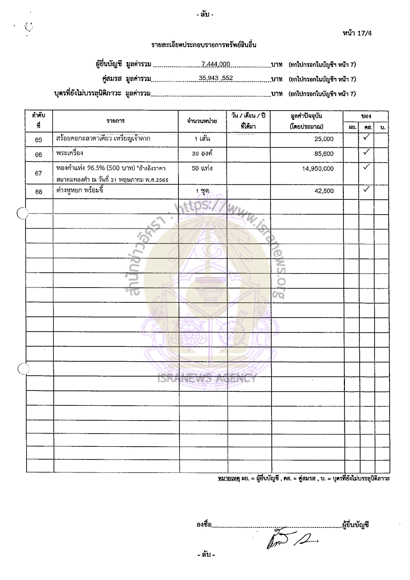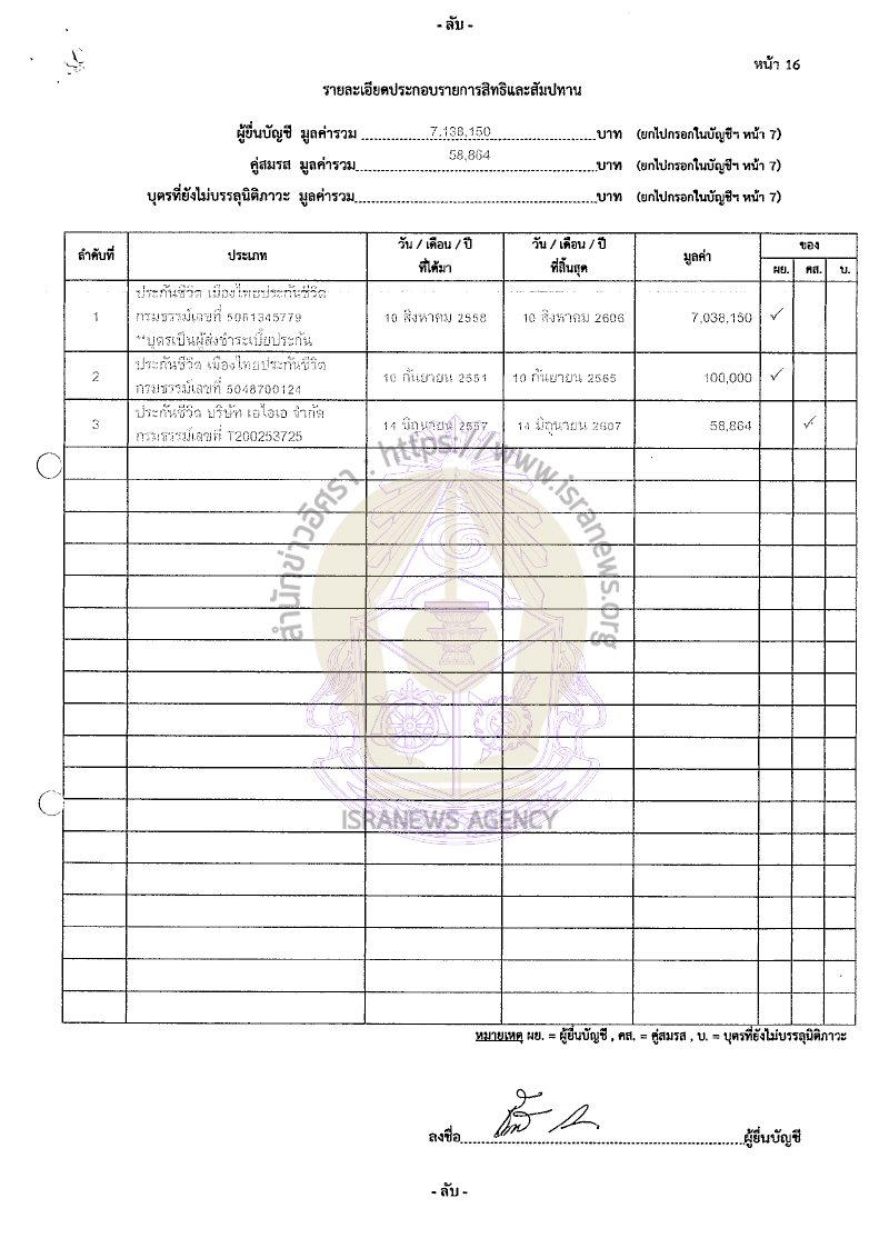 แจ้งมีรายจ่าย 1,305,450 บาท จากค่าอุปโภค บริโภค 250,000 บาท ค่าเบี้ยประกัน 1,005,450 บาท เงินบริจาค การกุศล 50,000 บาท