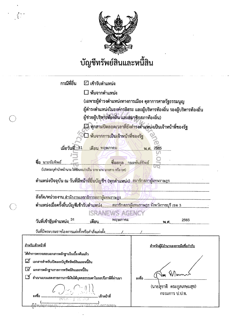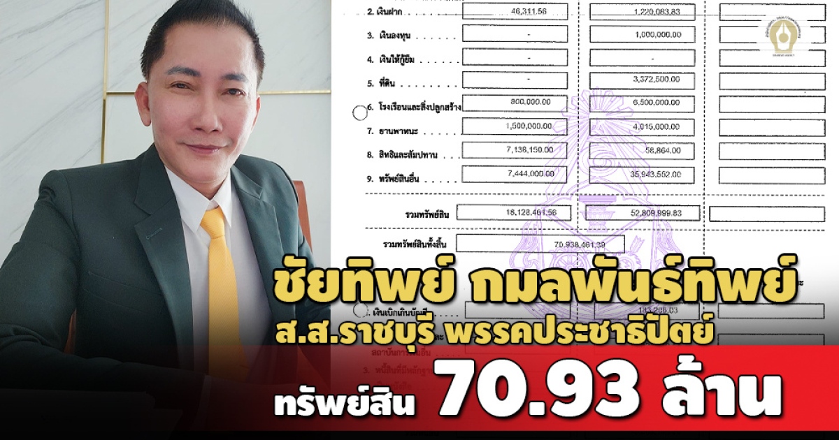 นายชัยทิพย์ กมลพันธ์ทิพย์ อายุ 58 ปี แจ้งมีทรัพย์สิน 18,128,461.56 บาท จากเงินสด 1,200,000 บาท เงินฝาก 3 บัญชี 46,311.56 บาท โรงเรือนและสิ่งปลูกสร้างเป็นห้องชุด 1 หลัง 800,000 บาท ยานพาหนะเป็นรถยนต์ 2 คัน 1,500,000 บาท สิทธิและสัมปทาน 7,138,150 บาท ทรัพย์สินอื่น 7,444,000 บาท