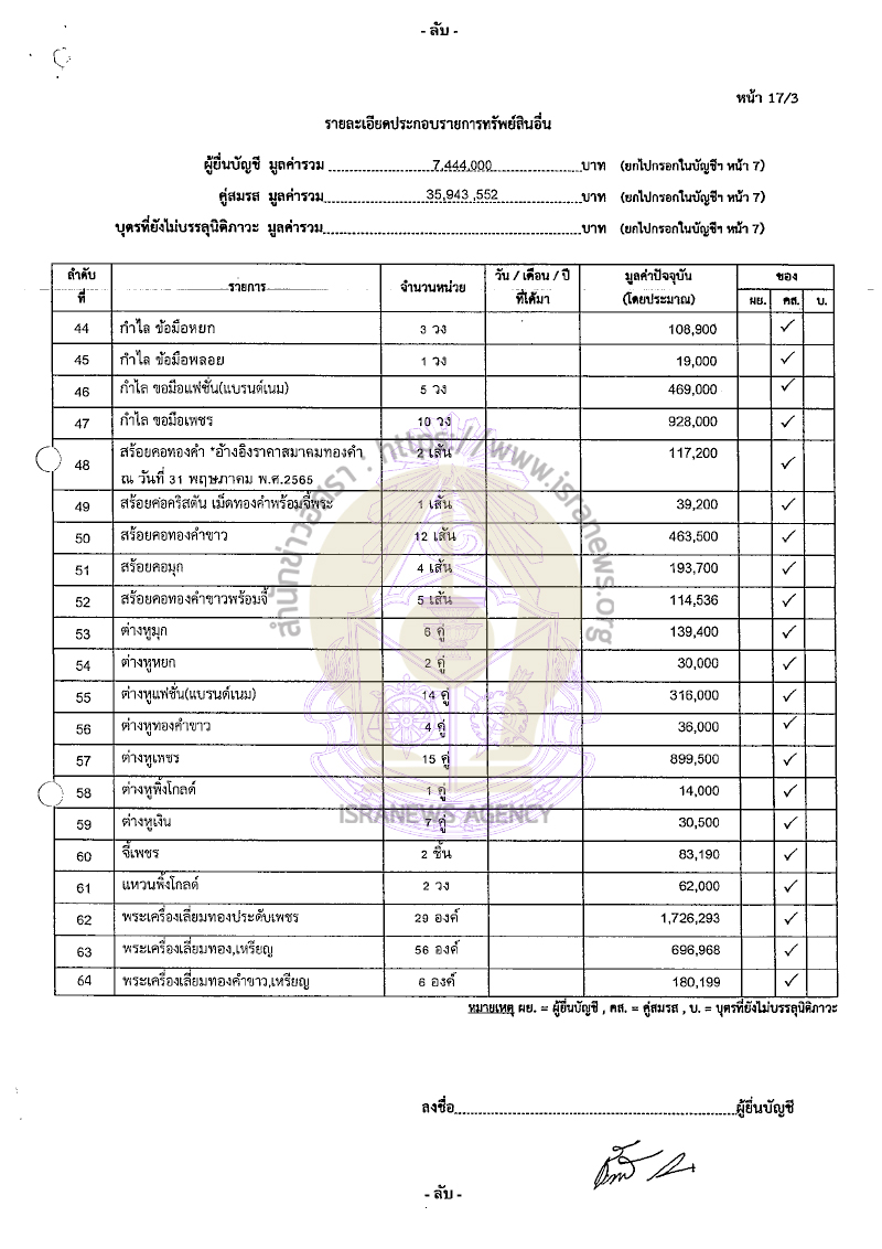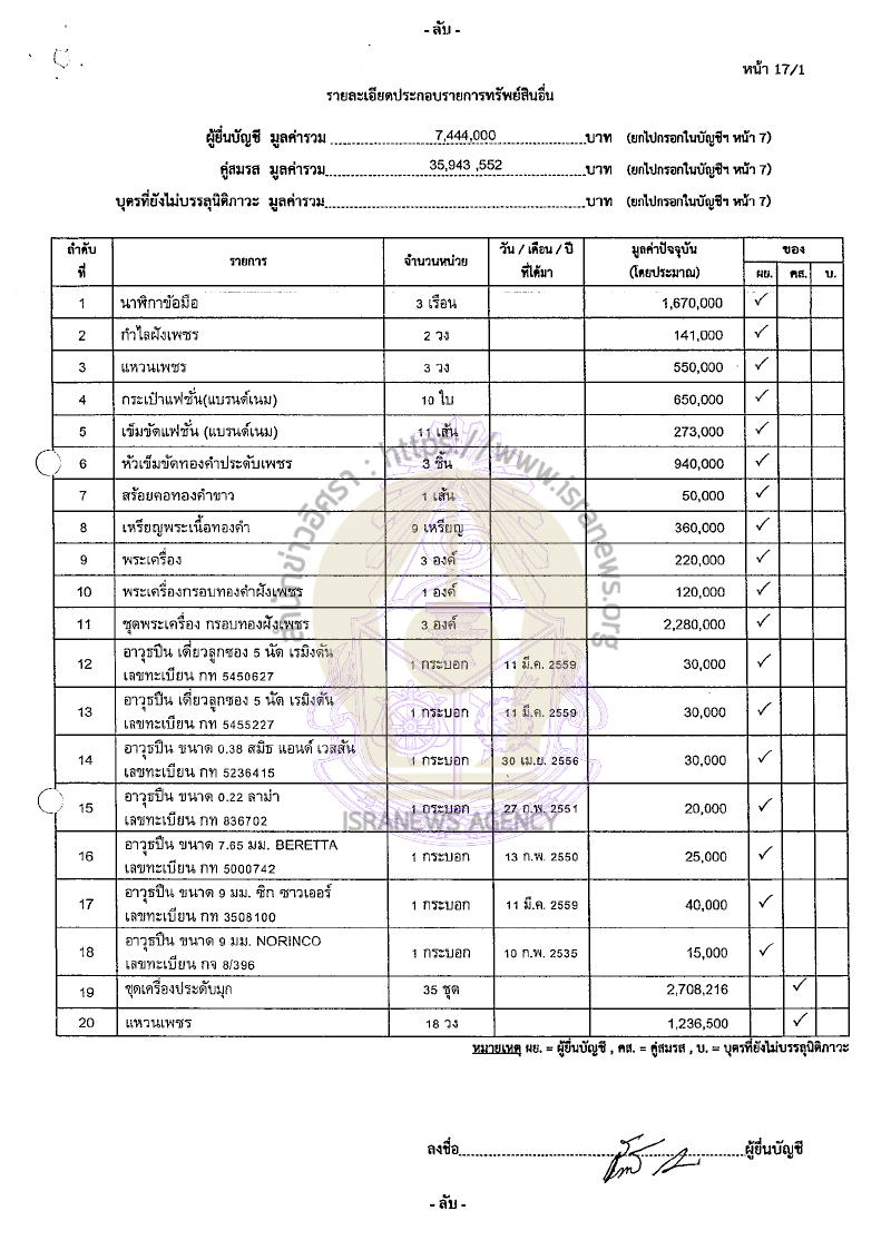 ทรัพย์สินที่น่าสนใจ นายชัยทิพย์ แจ้งมีนาฬิกา 3 เรือน กระเป๋าแบรนด์เนม 10 ใบ เข็มขัดแบรนด์เนม 11 เส้น หัวเข็มขัดทองคำประดับเพชร 3 ชิ้น ปืน 7 กระบอก พระเครื่อง และเครื่องประดับหลายรายการ