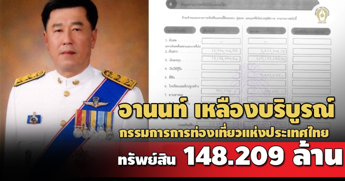 ทรัพย์สิน 148.20 ล้านบาท ‘อานนท์ เหลืองบริบูรณ์’ นั่งรองปลัดคมนาคม-บอร์ด ททท.ครบ 3 ปี เงินฝาก 6 บัญชี 12 ล้านบาท เงินลงทุน 11 รายการ 13 ล้านบาท พบคู่สมรสถือเงินลงทุน 33 รายการ มูลค่า 109 ล้านบาท
