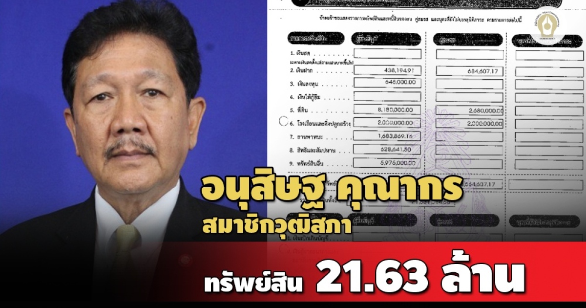 เปิดทรัพย์สิน สว.ใหม่ ‘อนุสิษฐ คุณากร’ ทรัพย์สินรวมภรรยา 21.63 ล้าน เฉพาะตัว 18.06 ล้าน เงินฝาก 5 บัญชี 4.38 แสนบ. กองทุนเปิด 3 บัญชี 6.45 แสน ที่ดิน 6 แปลง 8.18 ล. บ้าน 2 หลัง 2 ล. รถ 4 คัน 1.68 ล. ทรัพย์สินอื่นเป็นพระเครื่องมากสุด 5.97 ล.