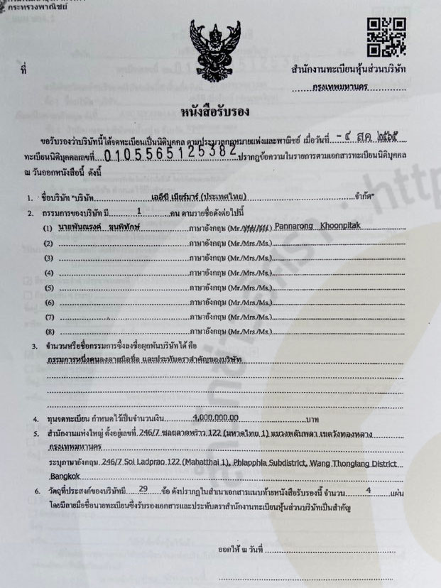 3.บริษัท เออีซี เมียนมาร์ (ประเทศไทย) จำกัด จดทะเบียนวันที่ 4 ส.ค. 2565 ทุน 4 ล้านบาท ประกอบธุรกิจให้บริการ โรงแรม รีสอร์ท อพาร์ทเม้นท์ ที่ตั้งเลขที่ 246/7 ซอยลาดพร้าว 122 (มหาดไทย 1) แขวงพลับพลา เขตวังทองหลาง กรุงเทพฯ นายพันณรงค์ เป็นกรรมการผู้ก่อตั้งและถือ 32,000 หุ้น อีก 2 คนคือ นายกรกฤช จุ้ยเชื้อ และ นางสาวศิภัชรดา ผิวทอง คนละ 4,000 หุ้น