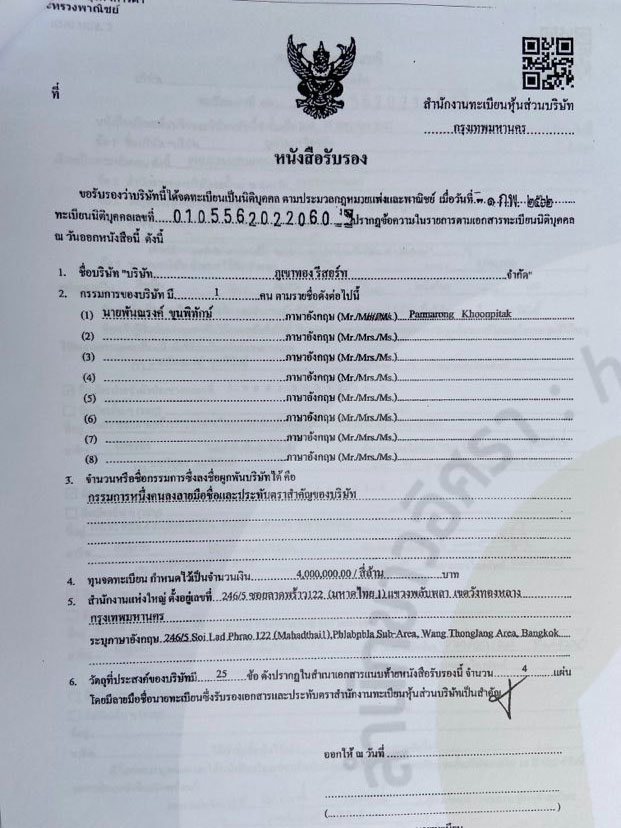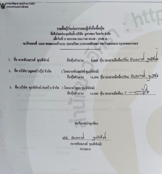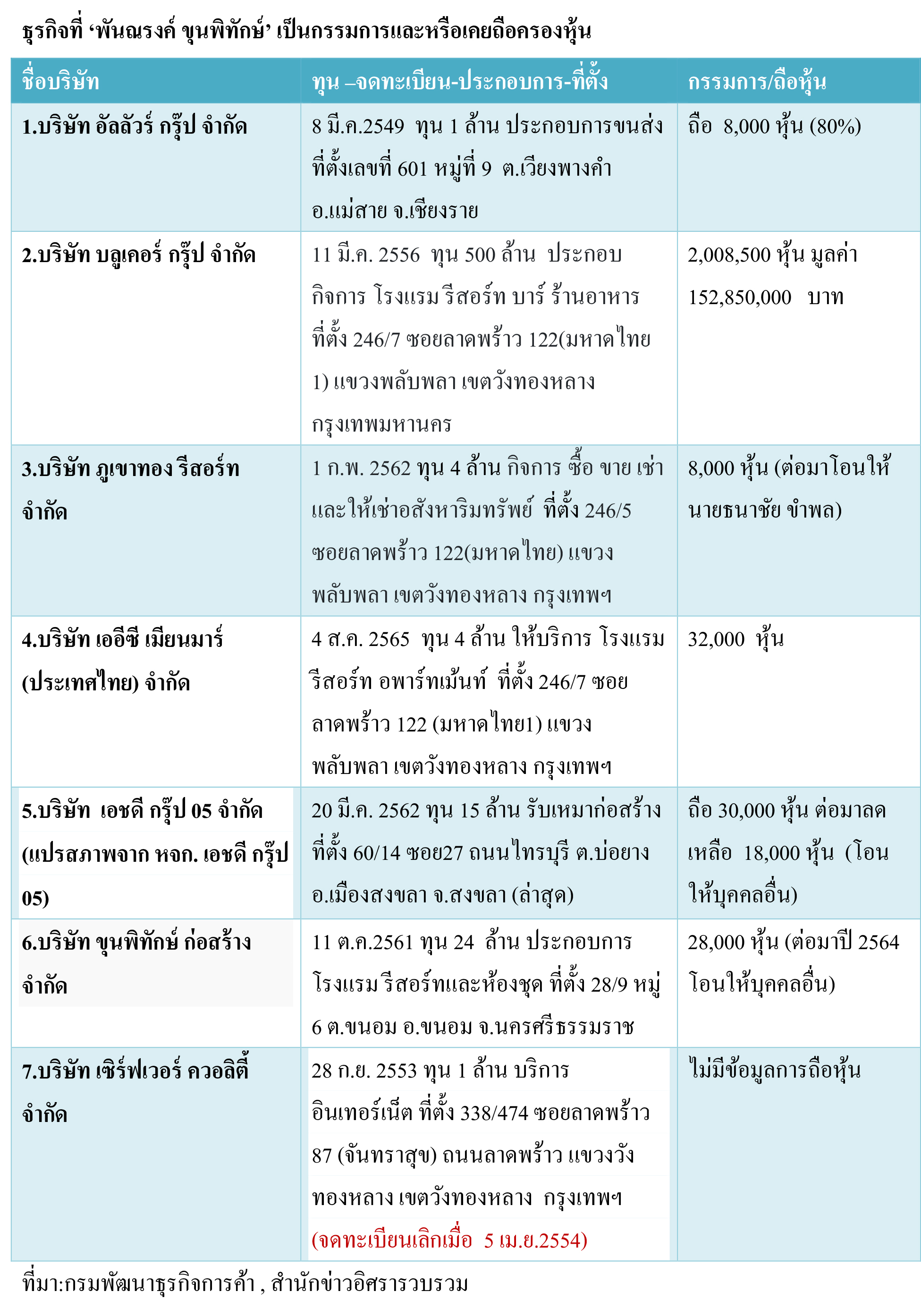 1.บริษัท บลูเคอร์ กรุ๊ป จำกัด จดทะเบียนวันที่ 11 มี.ค. 2556 ทุนล่าสุด 500 ล้านบาท ประกอบกิจการโรงแรม รีสอร์ท บาร์ ร้านอาหาร ที่ตั้ง 246/7 ซอยลาดพร้าว 122 (มหาดไทย 1) แขวงพลับพลา เขตวังทองหลาง กรุงเทพมหานคร นายพันณรงค์ ขุนพิทักษ์ นางสาว วีณาเนตรสุริยวงค์ เป็นกรรมการ บัญชีรายชื่อผู้ถือหุ้น ณ วันที่ 18 มกราคม 2565 นายพันณรงค์ ขุนพิทักษ์ ถือ 2,008,500 หุ้น มูลค่า 152,850,000 บาท ผู้ถือหุ้นอีก 2 คน คือ นายนราชัย รงค์ชนะ นายธนาชัย ขำพล