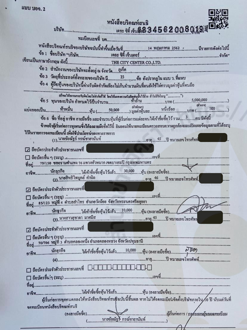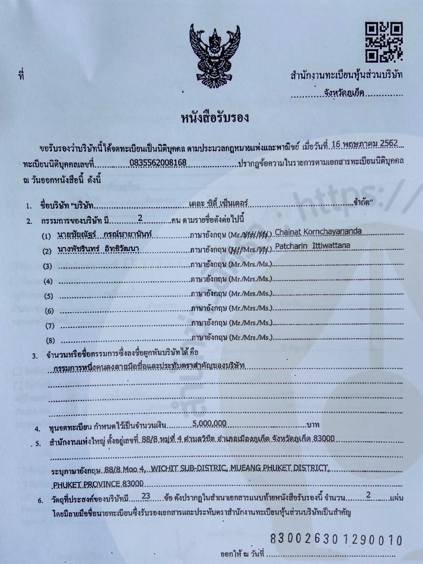 2.บริษัท เดอะ ซิตี้ เซ็นเตอร์ จำกัด จดทะเบียนวันที่ 16 พ.ค. 2562 ทุน 5 ล้าน ประกอบการซื้อและการขายอสังหาริมทรัพย์ ที่ตั้งเลขที่ 88/8 หมู่ที่ 4 ต.วิชิต อ.เมืองภูเก็ต จ.ภูเก็ต นายชัยณัฐร์ กรณ์ชายานันท์ เป็นกรรมการ นายชัยณัฐร์ กรณ์ชายานันท์ 30,000 หุ้น นายสิทธิไพบูลย์ คำนิล และนางสาวสุชาดา มาศมิส คนละ 10,000 หุ้น รวมทั้งหมด 50,000 หุ้น ๆละ 100 บาท (ดูเอกสาร)