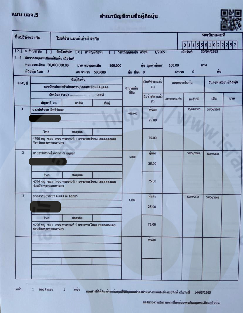 3.บริษัท โมเดิร์น แลนด์เฮ้าส์ จำกัด จดทะเบียนวันที่ 29 ส.ค. 2561 ทุน 50 ล้านบาท ประกอบการ ซื้อและขายอสังหาริมทรัพย์ ที่ตั้งเลขที่ 54 หมู่ 3 ตำบลศีรษะจรเข้น้อย อำเภอบางเสาธง จังหวัดสมุทรปราการ นางสาว พัชรินทร์ อิทธิวัฒนา เป็นกรรมกร บัญชีรายชื่อผู้ถือหุ้นล่าสุด ณ วันที่ 30 เม.ย. 2565 นางสาวพัชรินทร์ถือหุ้นใหญ่ 490,000 หุ้น นายธรรมรินทร์ คเนจร ณ อยุธยา คนละ 5,000 หุ้น รวม 500,000 หุ้น มูลค่าหุ้นละ 100 บาท (ดูเอกสาร)