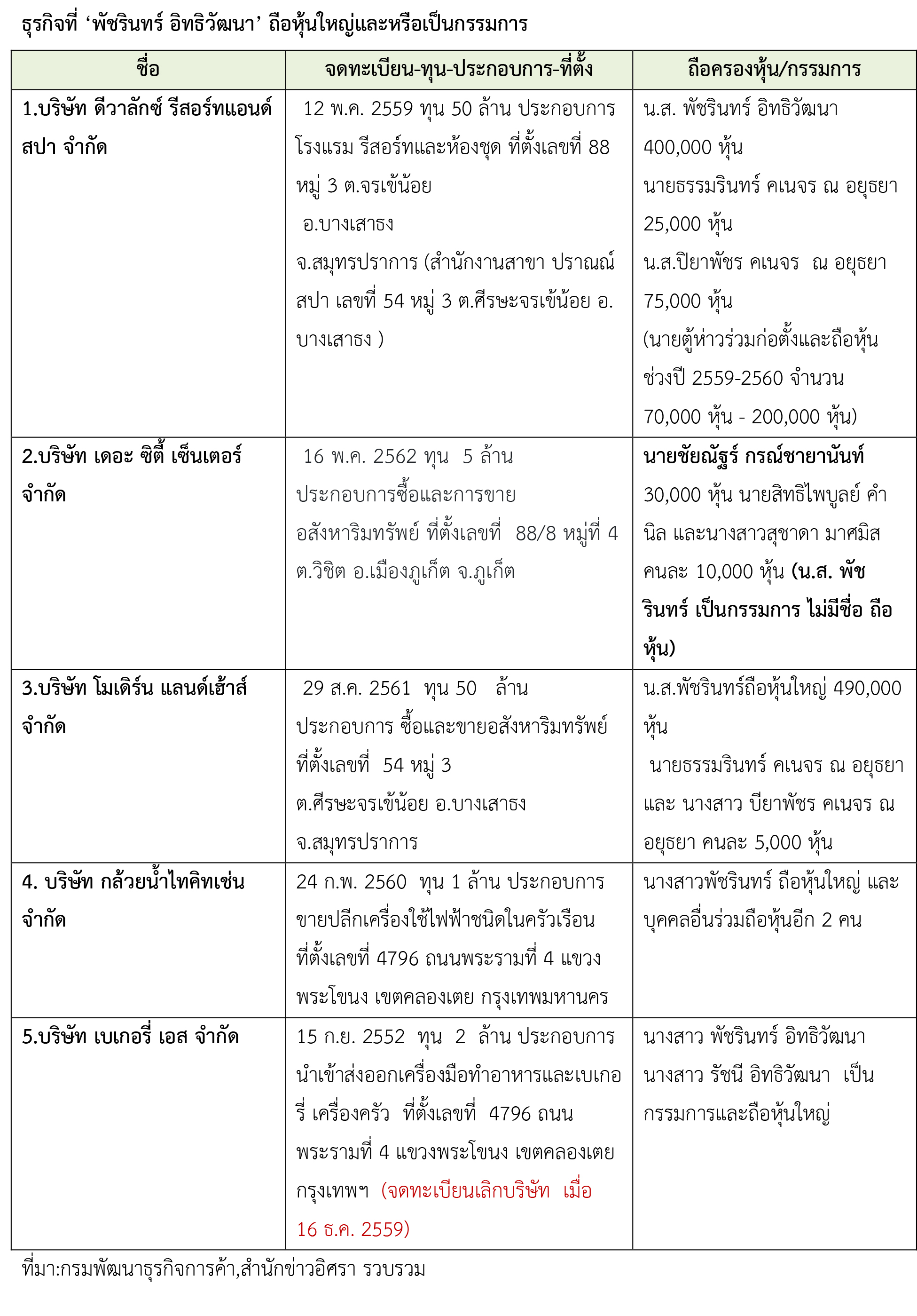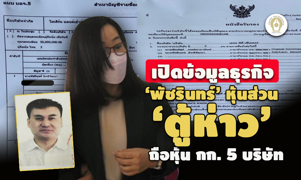 เปิดข้อมูลธุรกิจ ‘พัชรินทร์’ หุ้นส่วน บ.ดีวาลักซ์ รีสอร์ทฯ ‘ตู้ห่าว’ พบ ถือหุ้น กก. รวม 5 บริษัท 2 แห่ง โมเดิร์น แลนด์เฮ้าส์ อสังหาฯ อ.บางเสาธง จ.สมุทรปราการ - เดอะ ซิตี้ เซ็นเตอร์ จ.ภูเก็ต ด้วย