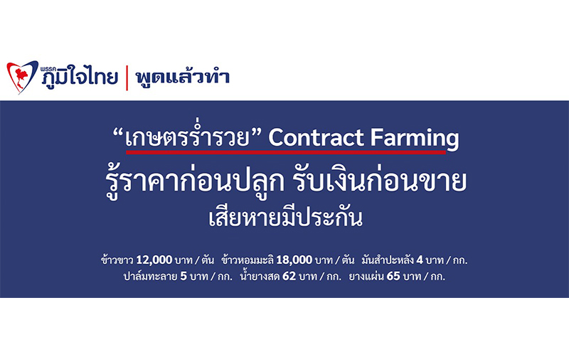 การทำ Contract Farming จะนำมาใช้กับ 4 ชนิด ที่มีการกำหนดราคารับซื้อล่วงหน้า ในตลาดโลก ได้แก่ ข้าว ยางพารา มันสำปะหลัง และ ปาล์มน้ำมัน และจะขยายไปสู่พืช หรือ ผลผลิตการเกษตรชนิดอื่นๆ ต่อไป เช่น ข้าวโพด มะพร้าว ลำไย ซึ่งเป็นพืชเศรษฐกิจ ของประเทศไทย