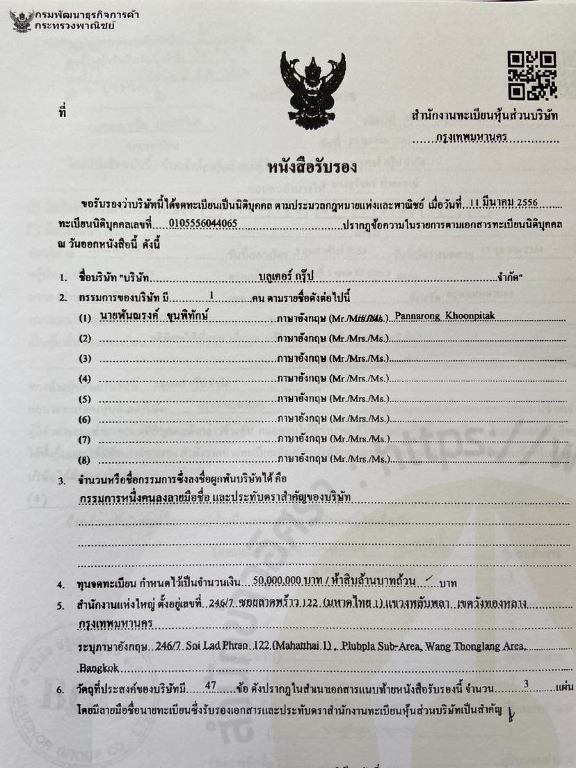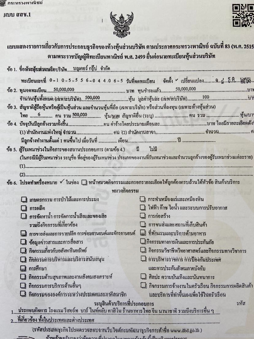 พร้อมกับ จดทะเบียนแก้ไขเพิ่มเติมวัตถุประสงค์ (แบบ สสช.1) ประกอบกิจการโรงแรม รีสอร์ท บาร์ กาสิโน ร้านอาหาร ที่เกี่ยวข้องในและต่างประเทศ