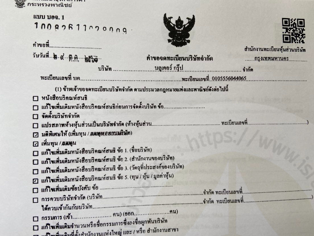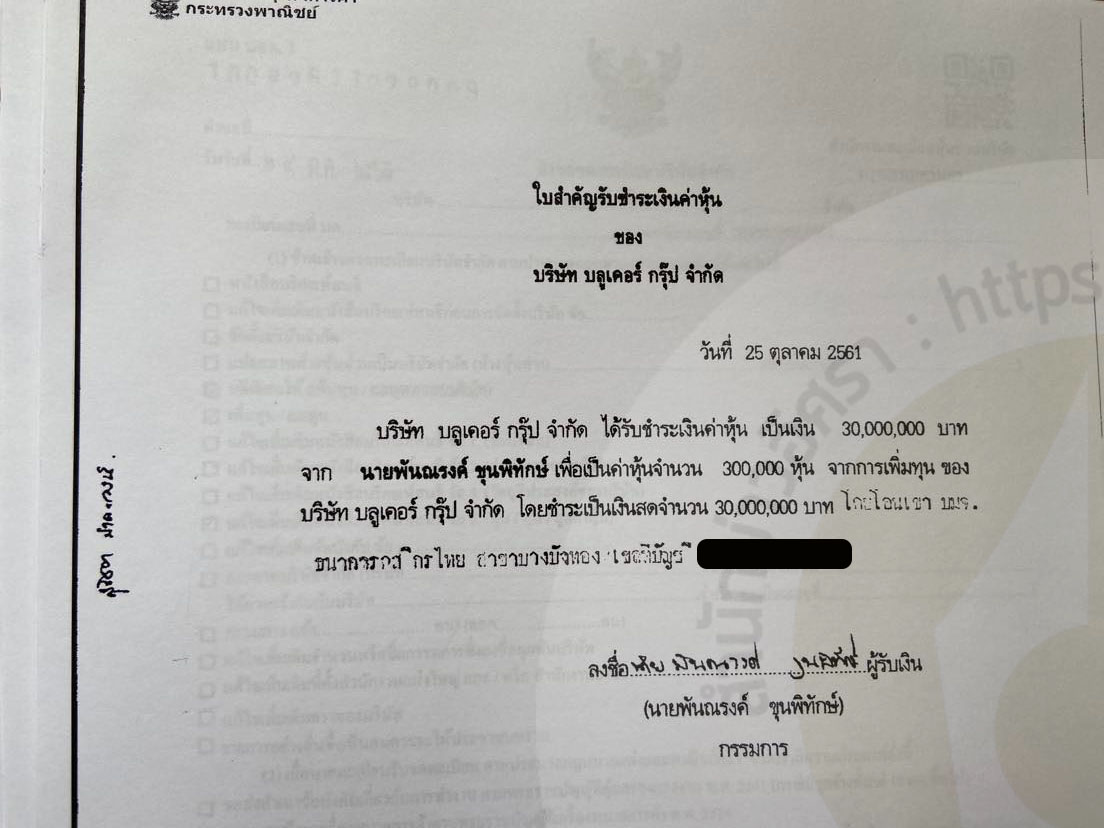 ล่าสุดจากตรวจสอบพบว่า ในการเพิ่มทุนจดทะเบียนจาก 20 ล้านบาท เป็น 50 ล้านบาท (เพิ่มทุน 30 ล้านบาท) ของบริษัท บลูเคอร์ กรุ๊ป จำกัด เมื่อวันที่ 29 ต.ค.2561 บริษัทฯระบุว่า เป็นการเพิ่มทุนโดยรับชำระเป็นเงินสด จำนวน 30 ล้านบาทจากนายพันณรงค์ เป็นค่าหุ้นเพิ่มทุน จำนวน 300,000 หุ้น โอนเข้าบัญชีธนาคารกสิกรไทยสาขาบางบัวทอง โดยมี หนังสือใบสำคัญรับชำระเงินค่าหุ้น ลงวันที่ 25 ต.ค.2561 เป็นหลักฐาน (ดูเอกสาร)