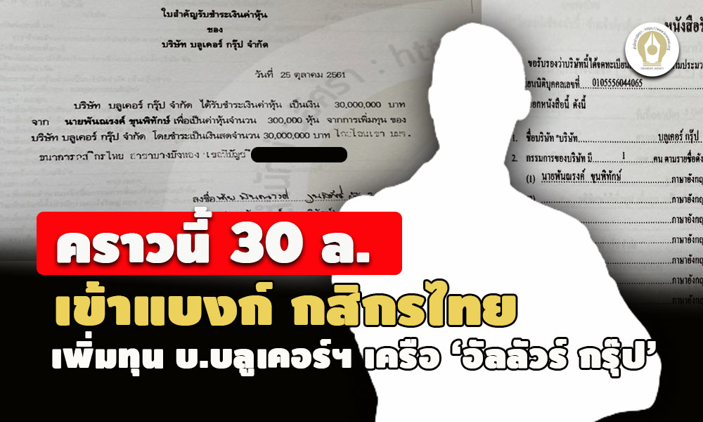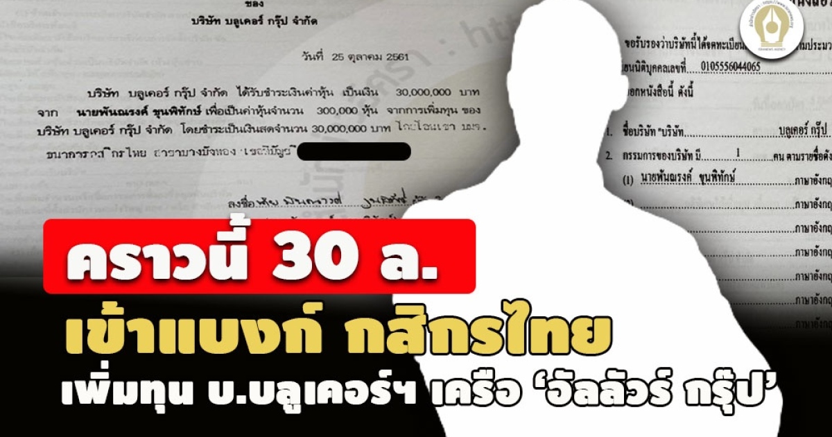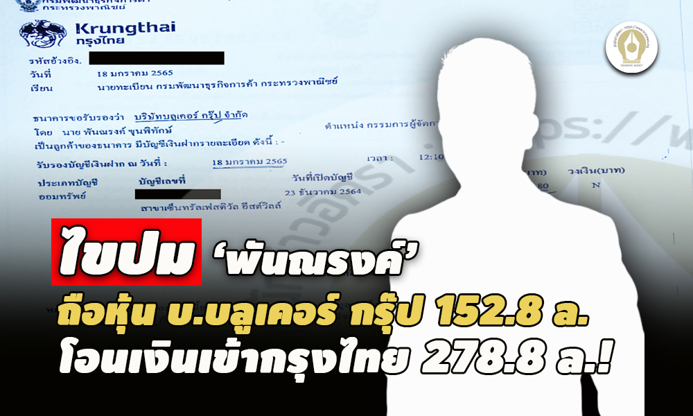 - โชว์โอนเงินเข้าแบงก์กรุงไทย 278.8 ล.! ไขปม‘พันณรงค์’ถือหุ้น บ.บลูเคอร์ กรุ๊ป 152.8 ล.
