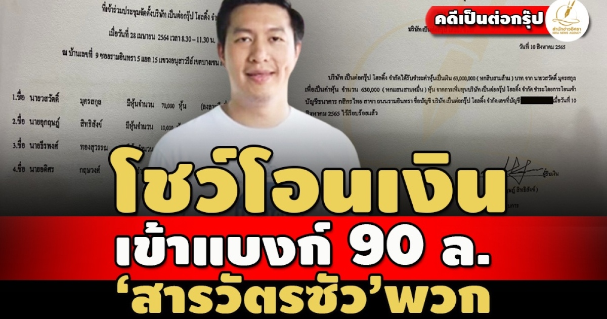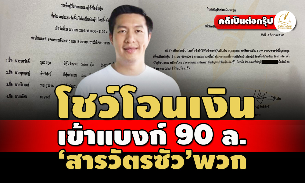 ตามส่อง บ.เป็นต่อกรุ๊ป โฮลดิ้ง เบื้องหลังจดทะเบียนเพิ่มทุนจาก 10 ล. เป็น 100 ล้าน โชว์เอกสารใบสำคัญรับชำระเงินลงหุ้น พ.ต.ท.วสวัตติ์ มุครสกุล กับพวกรวม 4 ราย โอนเงินเข้าแบงก์กสิกรไทยเรียบร้อย 90 ล. เฉพาะ ‘สารวัตรซัว’ 63 ล. ก่อนหน้าช่วงก่อตั้งอีก 7 ล. รวมเป็น 70 ล.