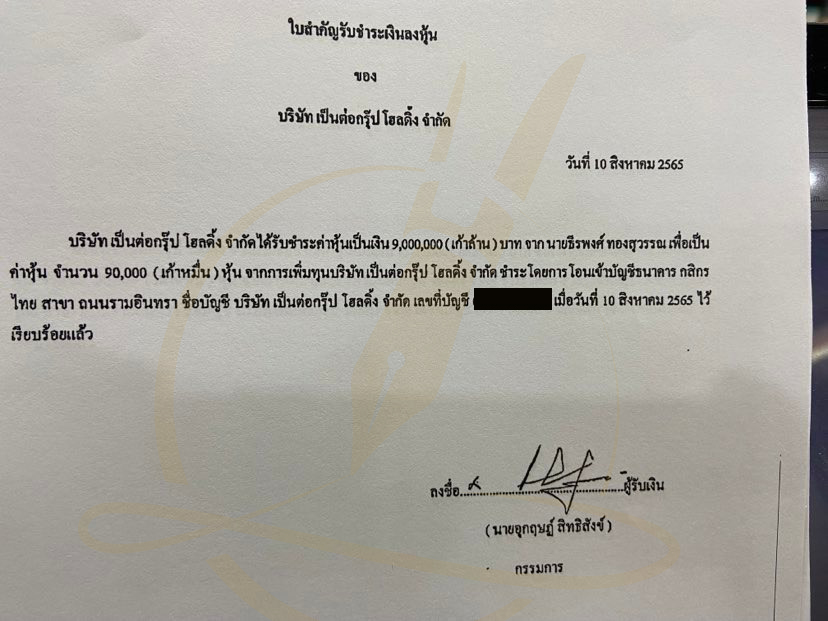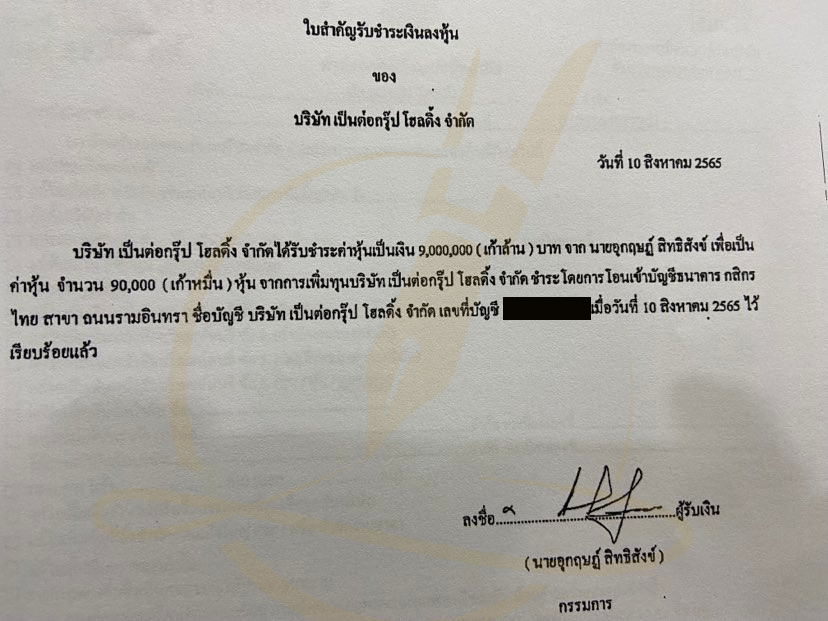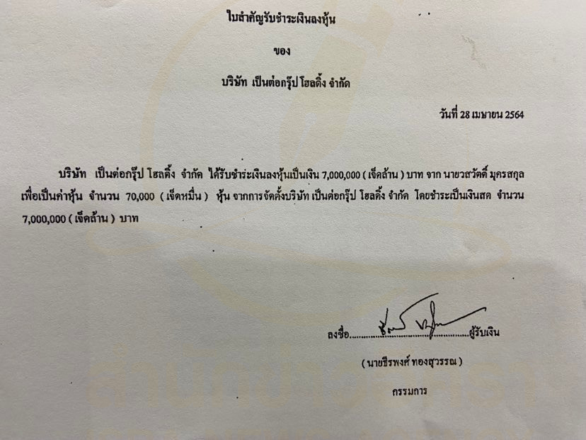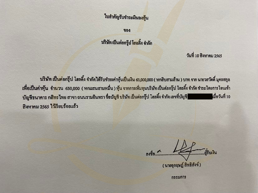 บริษัทฯ โดยนายอุกฤษฏ์ สิทธิสังข์ ในฐานะกรรมการ ได้นำส่งเอกสารใบสำคัญชำระเงินค่าหุ้น ของบริษัทฯ ต่อนายทะเบียนหุ้นส่วนบริษัทฯของผู้ถือหุ้น 4 ราย ว่าบริษัทฯได้รับชำระค่าหุ้นเป็นเงิน 63 ล้านบาท จาก นายวสวัตติ์ เพื่อเป็นค่าหุ้นจำนวน 630,000 หุ้น จากการเพิ่มทุน ชำระโดยการโอนเข้าบัญชีธนาคารกสิกรไทย สาขา รามอินทรา ชื่อ บัญชีบริษัท เป็นต่อกรุ๊ป โฮลดิ้ง จำกัด เลขที่ 097-1-56536-5 เมื่อวันที่ 10 สิงหาคม 2565 ไว้เรียบร้อยแล้ว (ดูเอกสาร)