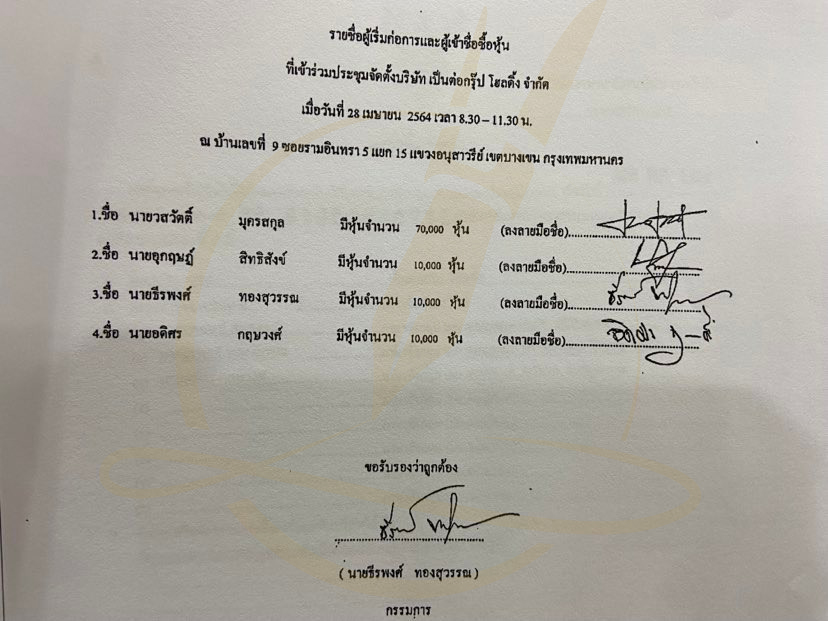และได้นำส่งเอกสารใบสำคัญชำระเงินค่าหุ้น ต่อนายทะเบียนหุ้นส่วนบริษัทฯของผู้ถือหุ้นอีก 3 ราย เพื่อชำระค่าหุ้น คนละ 90,000 หุ้น เป็นเงินคนละ 9 ล้านบาท โดยการโอนเข้าบัญชีธนาคารกสิกรไทย สาขา รามอินทรา ชื่อ บัญชีบริษัท เป็นต่อกรุ๊ป โฮลดิ้ง จำกัด เมื่อวันที่ 10 สิงหาคม 2565 เช่นเดียวกัน