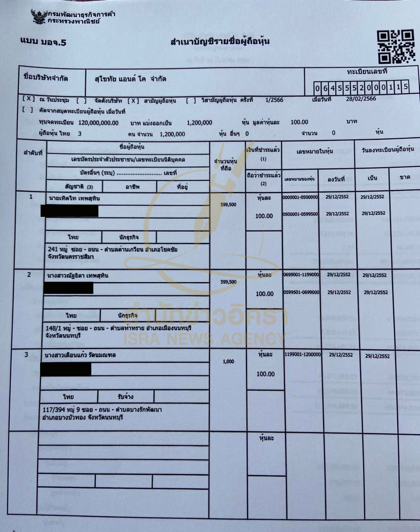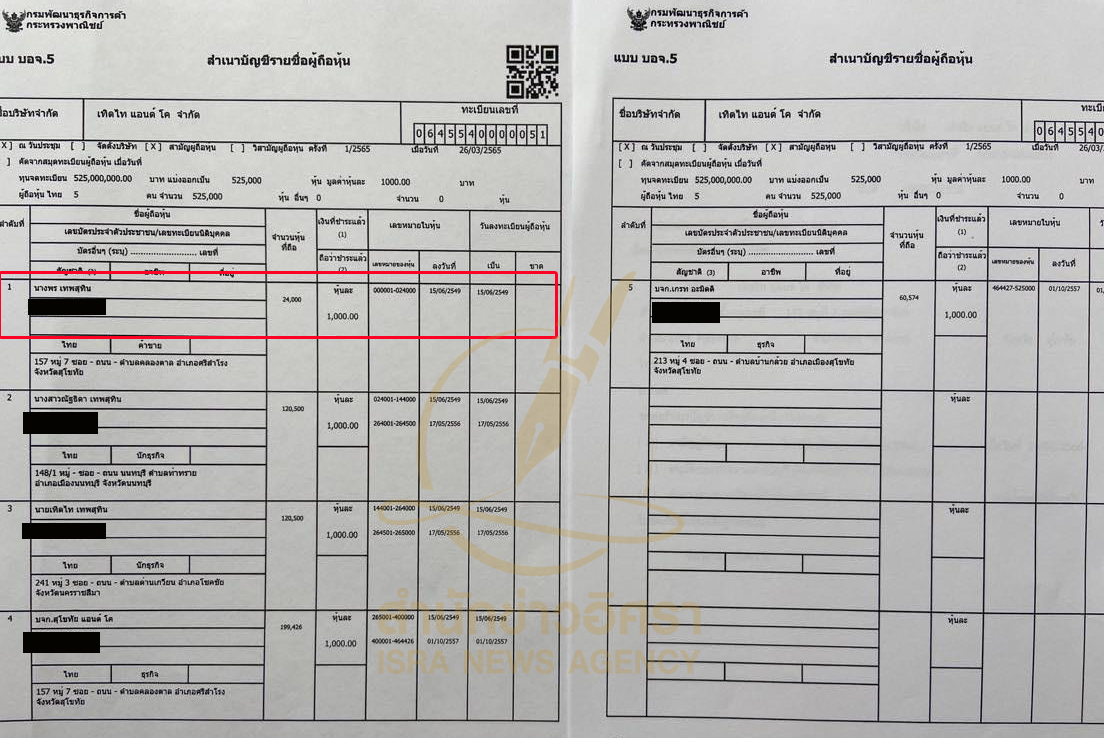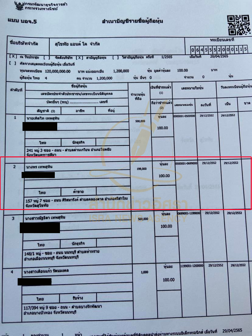 ล่าสุด สำนักข่าวอิศรา (www.isranews.org) ตรวจสอบบัญชีรายชื่อผู้ถือหุ้น (บอจ. 5 ) บริษัท เทิดไท แอนด์ โค จำกัด และ บริษัท สุโขทัย แอนด์ โค จำกัด ตั้งแต่ก่อตั้งจนถึงฉบับล่าสุด