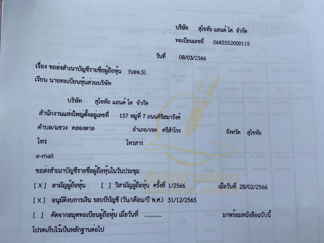 2.เมื่อวันที่ 8 มี.ค.2566 ( 08/03/2566 - วันเดียวกับกับรายแรก) บริษัท สุโขทัย แอนด์ โค จำกัดนำส่งสำเนาบัญชีรายชื่อผู้ถือหุ้น (บอจ.5) ต่อนายทะเบียนหุ้นส่วนบริษัท ระบุ ณ วันประชุมสามัญผู้ถือหุ้น ครั้งที่ 1/2566 เมื่อวันที่ 28 ก.พ.2566 (28/02/2566- วันเดียวกับกับรายแรก) มีผู้ถือหุ้น 3 ราย 1. นายเทิดไท เทพสุทิน 599,500 หุ้น 2.นางสาว ณัฐธิดา เทพสุทิน 599,500 หุ้น นางสาว เดือนแก้ว รัตนมณฑล 1,000 หุ้น รวม ทั้งหมด 1,200,000 หุ้น มูลค่าหุ้นละ 100 บาท