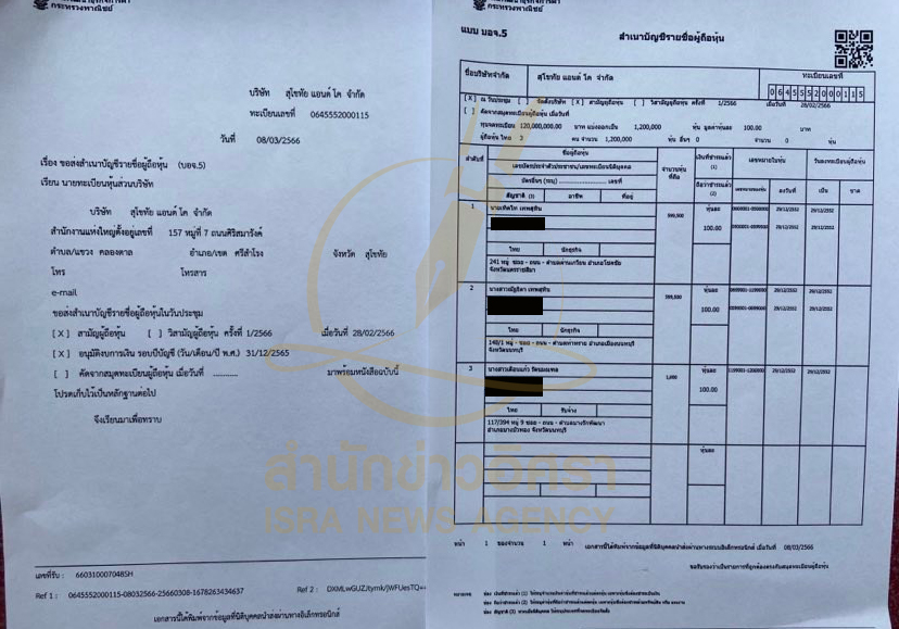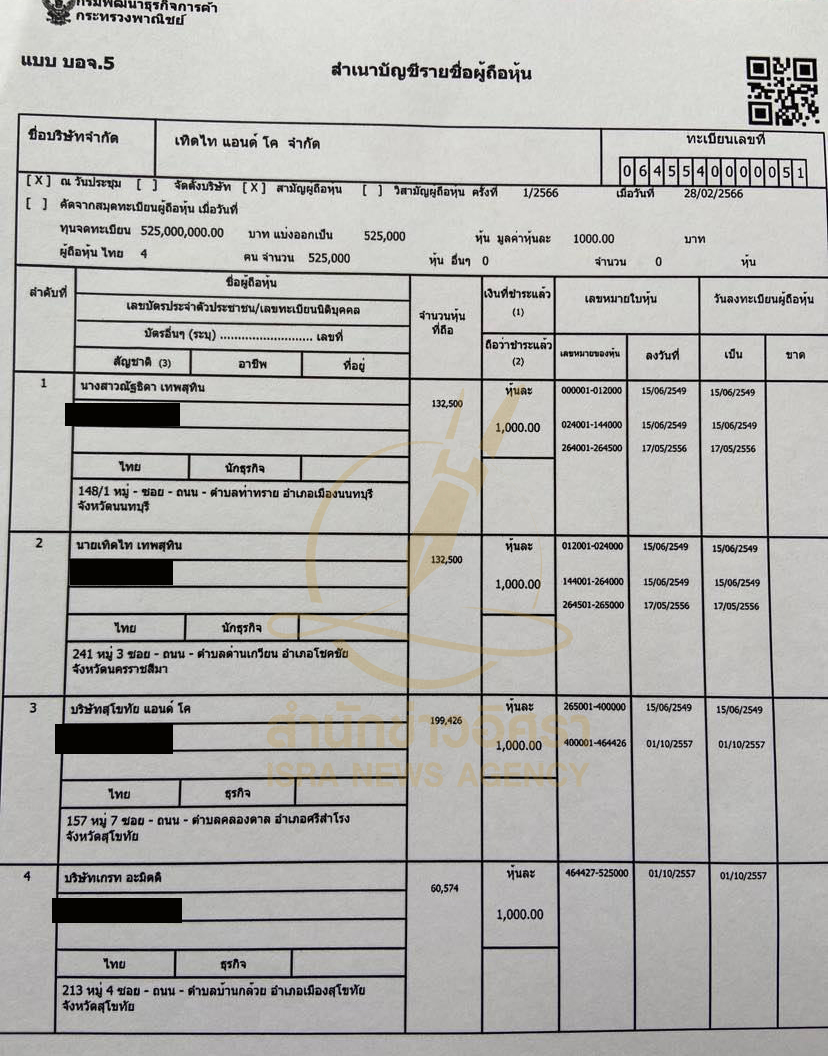 ( บอจ.5 ฉบับวันที่ 8 มี.ค.2566 หุ้นของนางพร จำนวน 24,000 หุ้น ถูกโอนไปให้นางสาวณัฐธิดา และนายเทิดไท เทพสุทิน) (ดูเอกสารประกอบ)
