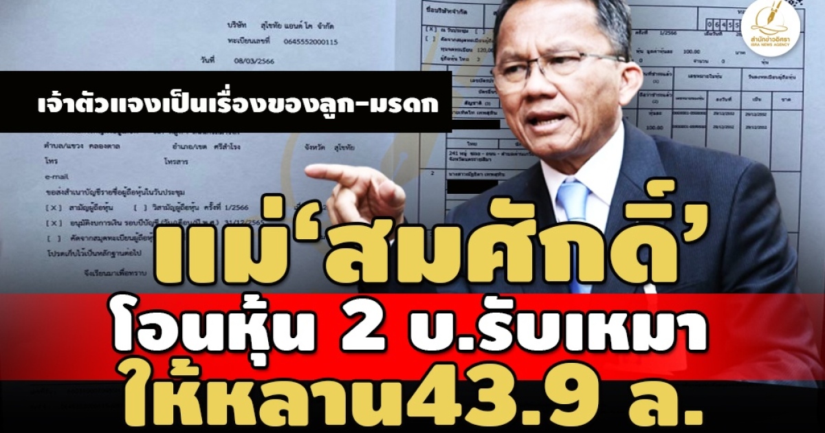 พบ 2 บ.รับเหมาครอบครัว‘เทพสุทิน’เปลี่ยนผู้ถือหุ้นใหม่ แม่‘สมศักดิ์’โอน ให้‘ณัฐธิดา-เทิดไท’ 223,000 หุ้น 43.9 ล. เพิ่งส่ง อบจ.5 ล่าสุด 8 มี.ค.66 ขณะที่เจ้าตัวแจงเป็นเรื่องของลูก ตัวเอง-ภรรยาไม่ได้ทำธุรกิจนานแล้ว ส่วนของแม่มีเป็นมรดก