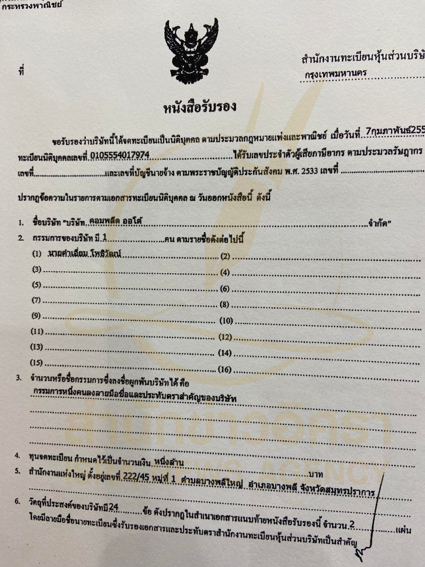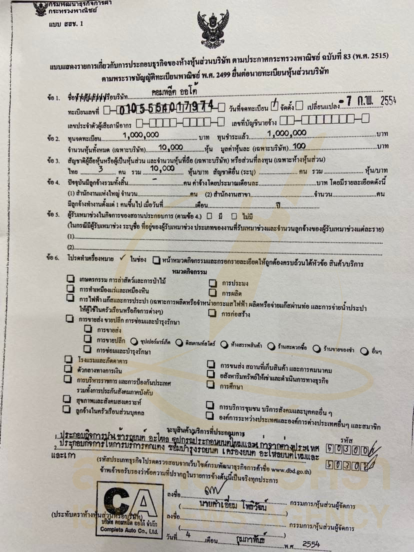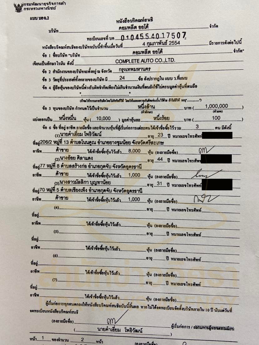 จากการตรวจสอบพบว่า บริษัท คอมพลีต ออโต้ จำกัด จดทะเบียนวันที่ 7 ก.พ. 2554 ทุน 1 ล้านบาท แจ้งวัตถุประสงค์ (แบบ สสช.1) 2 ข้อ 1.ประกอบกิจการนำเข้ารถยนต์ อะไหล่ อุปกรณ์ประกอบรถยนต์ใหม่และเก่าจากต่างประเทศ และ 2. ประกอบกิจการให้บริการตกแต่ง ซ่อมบำรุงรถยนต์ เครื่องยนต์ ที่ตั้งเลขที่ 73 โครงการไทยสมาร์ทคาร์พลาซ่า พื้นที่ 14 ถนนพระราม 9 แขวงห้วยขวาง เขตห้วยขวาง กรุงเทพฯ นายคำเอี่ยม โพธิวัฒน์ อายุ 23 ปี เป็นกรรมการ ผู้ถือหุ้น 3 คน ได้แก่ นายคำเอี่ยม โพธิวัฒน์ ถือ 8,000 หุ้น นางอ้อย ศิลาแดง และ น.ส.มัลลิกา บุญทาน้อย คนละ 1,000 หุ้น รวมทั้งหมด 10,000 หุ้น มูลค่าหุ้นละ 100 บาท (ดูเอกสาร)