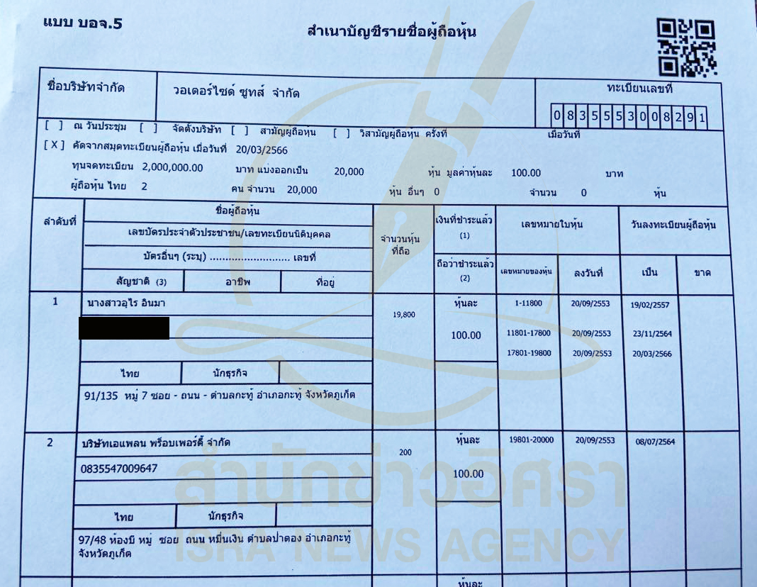 2. บริษัท วอเตอร์ไซด์ ซูทส์ จำกัด (ชื่อเดิม บริษัท ซี แอนด์ อาร์ โซลูชันส์ จำกัด) บัญชีรายชื่อผู้ถือหุ้น (บอจ.5) ณ วันที่ 29 ธ.ค. 2565 จำนวน 3 ราย นางสาวอุไร อินมา 17,800 หุ้น (89%) นายรามา รัศมีรามา 2,000 หุ้น (10%) และ บริษัท เอ แพลน พร็อบเพอร์ตี้ จำกัด 200 หุ้น (1%) รวมทั้งหมด 20,000 หุ้น มูลค่าหุ้นละ 100 บาท