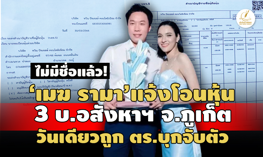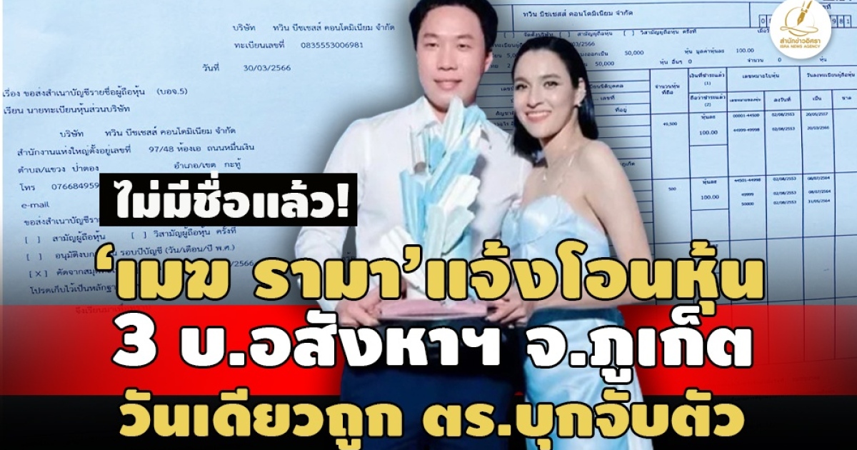 ล่าสุด 3 บริษัทโรงแรม อสังหาฯ จ.ภูเก็ต ไม่มีชื่อ ‘รามา รัศมีรามา’ สามีนักแสดง ถือครองหุ้นแล้ว พบนำส่ง บอจ. 5 นายทะเบียน ทางออนไลน์ เมื่อ 30 มี.ค. 2566 วันเดียวถูก ตร.บุกจับที่บ้านในกรุงเทพฯ
