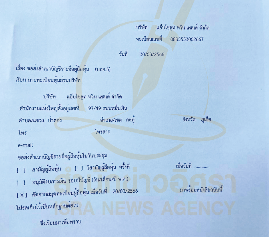 1.บริษัท แอ็บโซลูท ทวิน แซนด์ จำกัด บัญชีรายชื่อผู้ถือหุ้น (บอจ.5) ณ วันที่ 21 มิ.ย. 2565 ผู้ถือหุนจำนวน 3 ราย ได้แก่ นางสาวอุไร อินมา 44,500 หุ้น (89%) นายรามา รัศมีรามา 5,000 หุ้น ( 10%) และ บริษัท เอ แพลน พร็อบเพอร์ตี้ จำกัด 500 หุ้น (1%) รวมหุ้นทั้งหมด 50,000 หุ้น มูลค่าหุ้นละ 100 บาท
