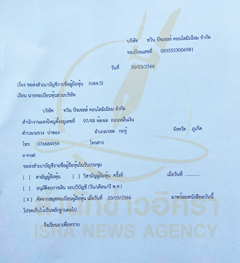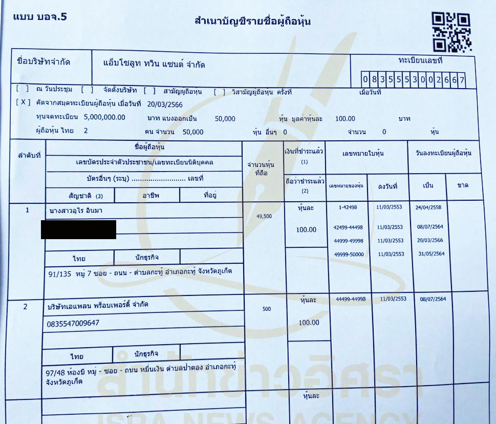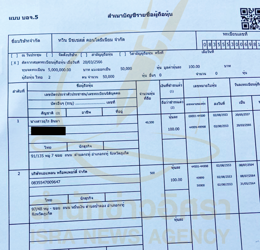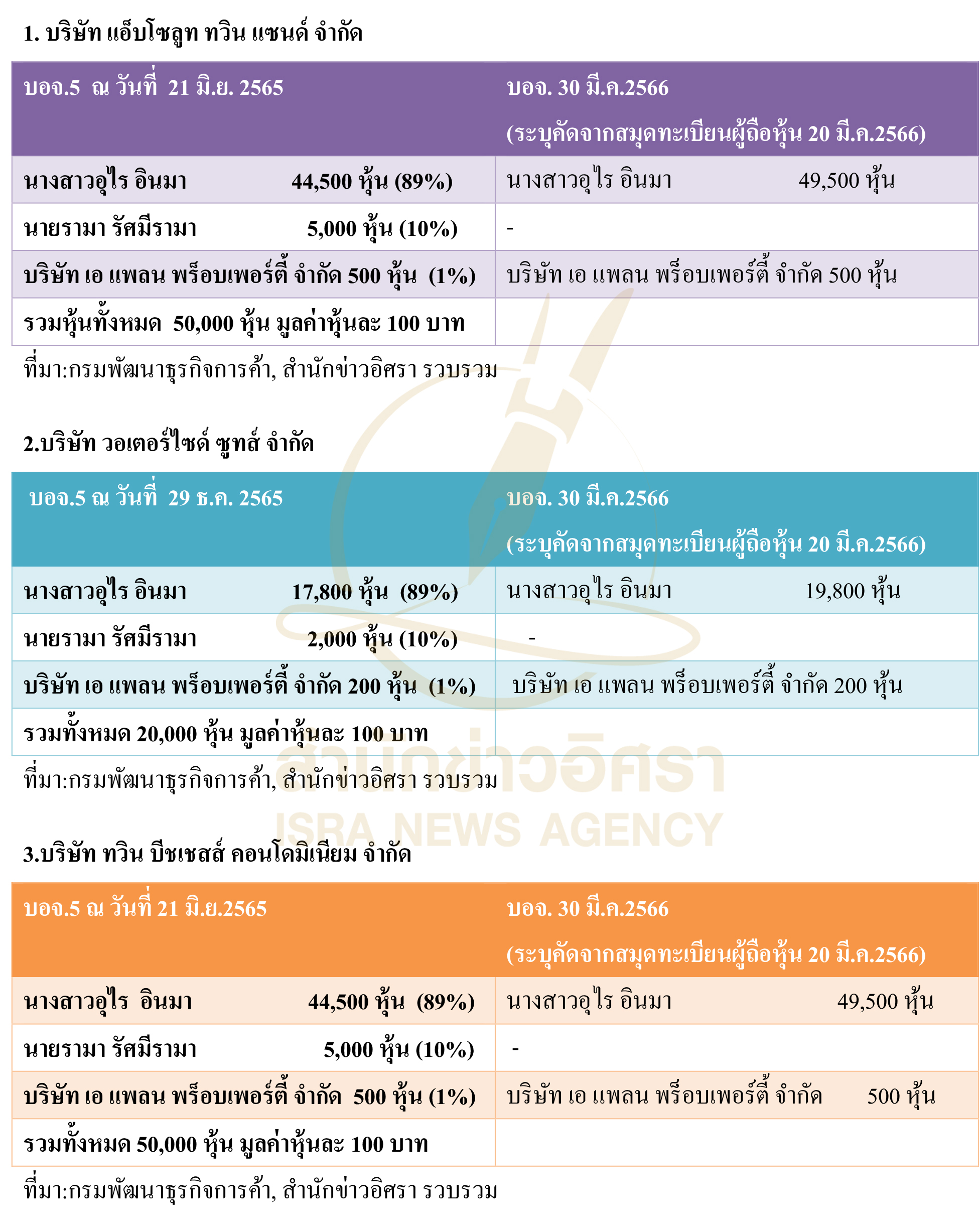 3. บริษัท ทวิน บีชเชสส์ คอนโดมิเนียม จำกัด บัญชีรายชื่อผู้ถือหุ้น (บอจ.5) ณ วันที่ 21 มิ.ย. 2565 จำนวน 3 ราย นางสาวอุไร อินมา 44,500 หุ้น (89%) นายรามา รัศมีรามา 5,000 หุ้น (10%) และบริษัท เอ แพลน พร็อบเพอร์ตี้ จำกัด 500 หุ้น รวมทั้งหมด 50,000 หุ้น มูลค่าหุ้นละ 100 บาท