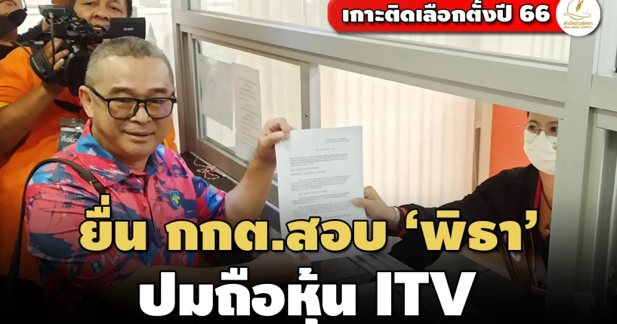 สำนักข่าวอิศรา (www.isranews.org) รายงานว่า วันที่ 10 พฤษภาคม 2566 นายเรืองไกร ลีกิจวัฒนะ ผู้สมัคร ส.ส.บัญชีรายชี่อ พรรคพลังประชารัฐ (พปชร.) ยื่นคำร้องต่อ คณะกรรมการการเลือกตั้ง (กกต.) ขอให้ตรวจสอบว่าการที่นายพิธา ลิ้มเจริญรัตน์ ผู้สมัคร ส.ส.และแคดดิเดตนายกรัฐมนตรีของพรรคก้าวไกล (ก.ก.) มีลักษณะต้องห้ามในการลงสมัครรับเลือกตั้งตามรัฐธรรมนูญ มาตรา 98 ( 3 ) หรือไม่ เนื่องจากมีชื่อเป็นผู้ถือหุ้นบริษัท ไอทีวี จำกัด (มหาชน) 42,000 หุ้น