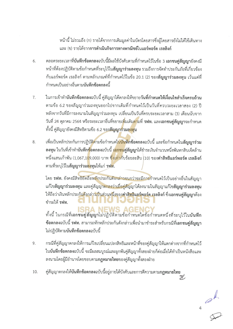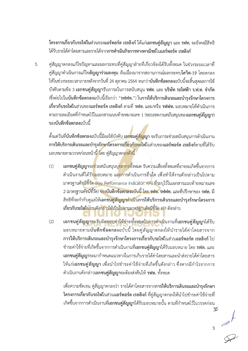 3.ในช่วงเวลาที่คู่สัญญาดำเนินการแก้ไขสัญญาณร่วมลงทุน จนกว่า บันทึกข้อตกลงจะสิ้นสุดผลการใช้บังคับ เอกชนคู่สัญญาจะต้องรับภาระในการสนับสนุน รฟท. และบจ.รถไฟฟ้า ร.ฟ.ท. (รฟฟท.) ในการให้บริการเดินรถและบำรุงรักษาโครงการเกี่ยวกับรถไฟในส่วนของแอร์พอร์ตเรลลิ้งค์ ตามที่ทั้งสองหน่วยงานมอบหมายให้ดำเนินการ