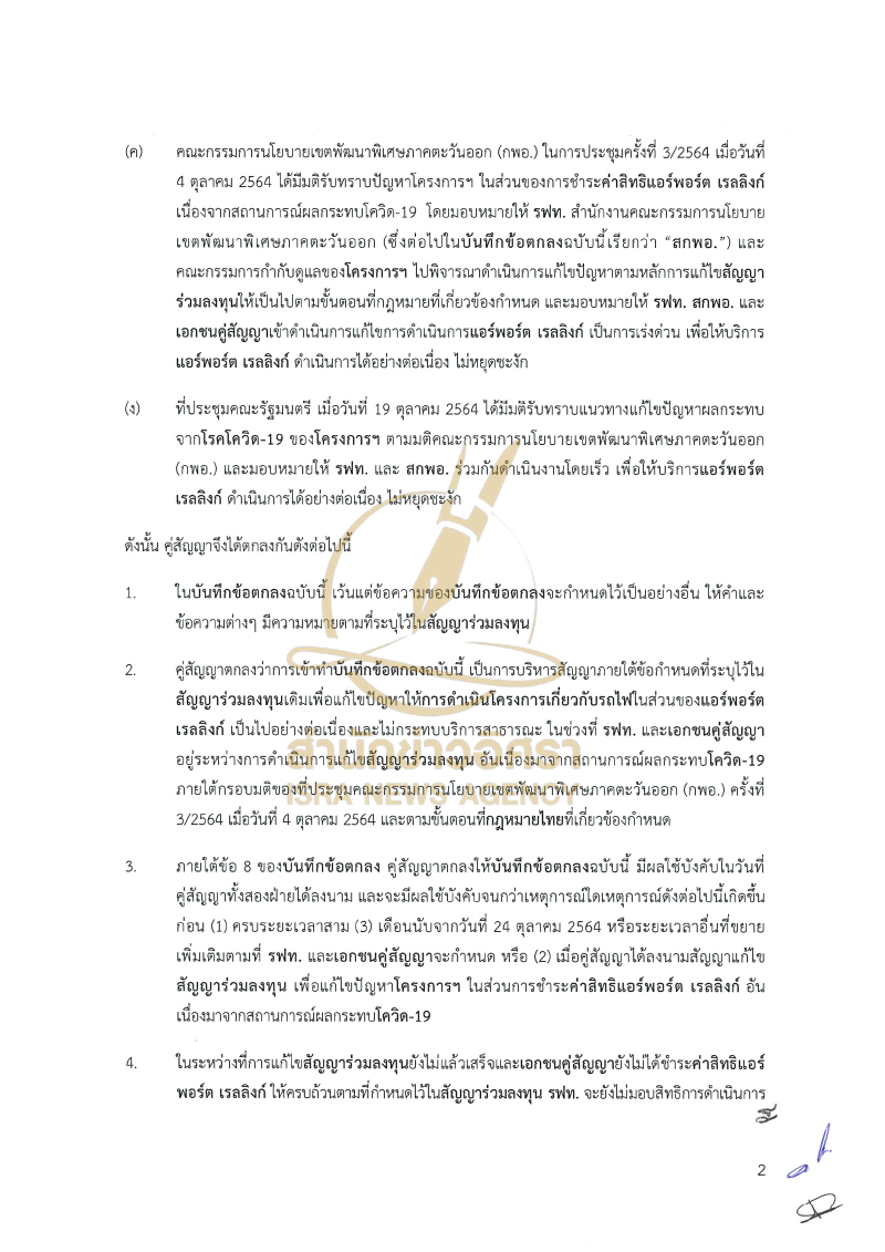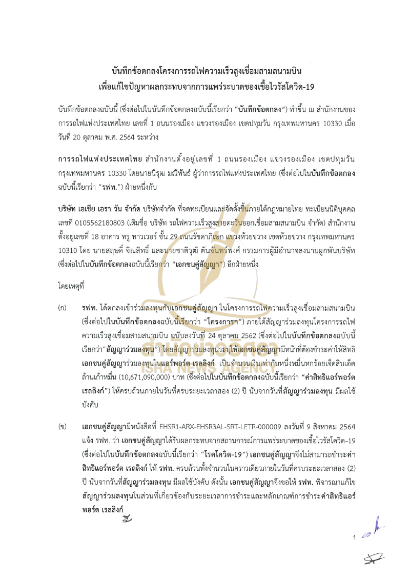 1.บันทึกข้อตกลงฉบับนี้มีผลใช้บังคับในวันที่คู่สัญญาทั้งสองฝ่ายได้ลงนามและจะมีผลใช้บังคับจนกว่าเหตุการณ์ใดเหตุการณ์ดังต่อไปนี้เกิดขึ้น กรณีที่ 1 ครบระยะเวลา 3 เดือนนับจากวันที่ 24 ตุลาคม 2564 หรือระยะเวลาอื่นที่ขยายเพิ่มเติมตามที่คู่สัญญาทั้งสองจะกำหนด กรณีที่ 2 เมื่อคู่สัญญาได้ลงนามสัญญาแก้ไขสัญญาณร่วมลงทุนเพื่อแก้ปัญหาโครงการรถไฟความเร็วสูงเชื่อม 3 สนามบินในส่วนการชำระค่าใช้สิทธิ์แอร์พอร์ตเรลลิ้งค์