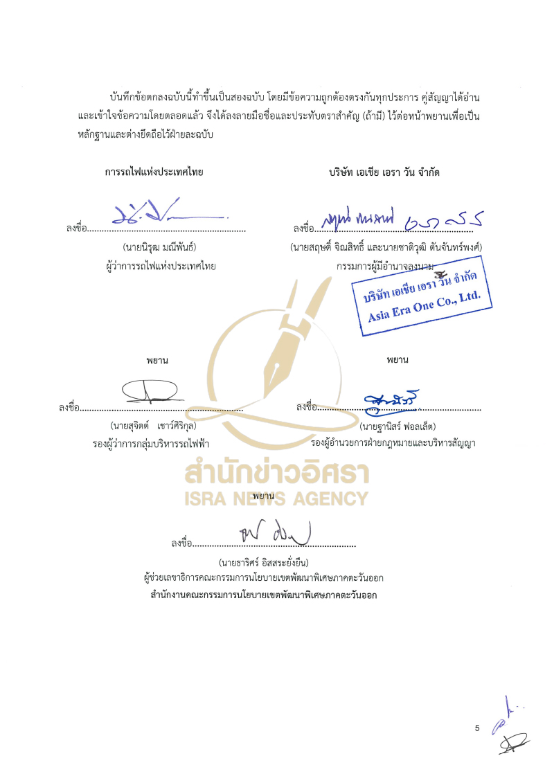 ผู้ลงนาม MOU ประกอบด้วย นายนิรุฒ มณีพันธ์ ผู้ว่ารฟท., นายสุจิตต์ เชาว์ศิริกุล รองผู้ว่ากลุ่มบริหารรถไฟฟ้า รฟท. (พยาน), นายสฤษดิ์ จิณสิทธิ์และนายชาติวุฒิ ตันจันทรพงศ์ ในฐานะกรรมการผู้มีอำนาจลงนาม บจ.เอเชีย เอราวัณ , นายฐานิสร์ ฟอลเล็ต รองผู้อำนวยการฝ่ายกฎหมายและริหารสัญญา (พยาน) และนายธาริศร์ อิสสระยั่งยืน ผู้ช่วยเลขาธิการคณะกรรมการนโยบายเขตพัฒนาพิเศษภาคตะวันออก (พยาน)เอกสาร MOU มีจำนวน 5 หน้า ไม่รวมส่วนเอกสารแนบท้ายสัญญา