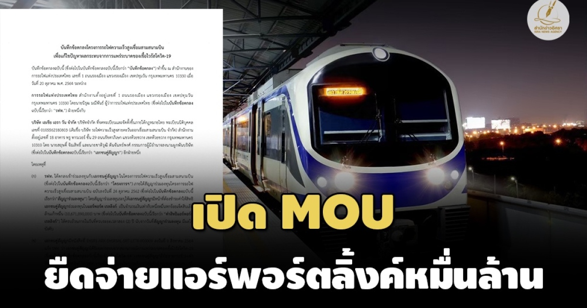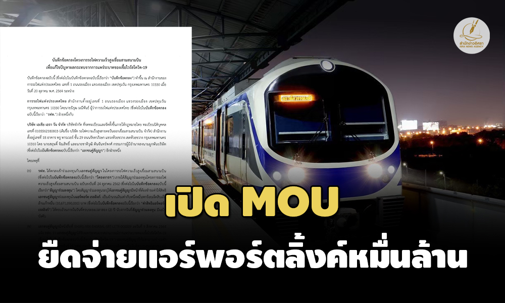 ผู้สื่อข่าวรายงานว่า สำหรับ MOU ที่ผู้ว่ารฟท.กล่าวถึง มีการจัดทำเมื่อวันที่ 20 ต.ค. 2564 มีชื่ออย่างเป็นทางการว่า ‘บันทึกข้อตกลงโครงการรถไฟความเร็วสูงเชื่อม 3 สนามบินเพื่อแก้ไขปัญหาผลกระทบจากการแพร่ระบาดของเชื้อไวรัสโควิด-19’