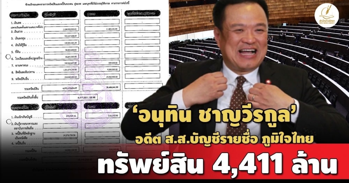 ป.ป.ช.เปิดบัญชีทรัพย์สิน 'อนุทิน ชาญวีรกูล' กรณีพ้นตำแหน่ง ส.ส.บัญชีรายชื่อ พรรคภูมิใจไทย ทรัพย์สินกว่า 4,411 ล. ให้ บจก.ไทยสเปเชียล สตีล กู้ยืม 135 ล. มีรถหรู 2 คัน เรือ 2 ลำ เครื่องบิน 3 ลำ สะสมพระ-เครื่องเบณจรงค์-รูปติดข้างฝา รายได้ 2.2 ล./ปี