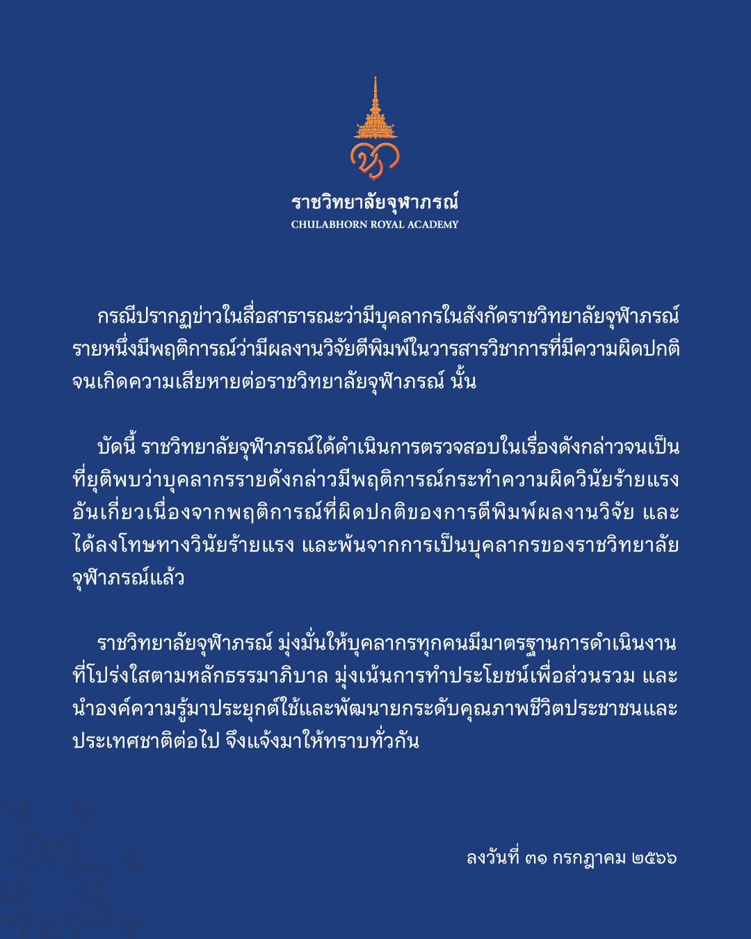 ก่อนที่เมื่อวันที่ 31 ก.ค. 2566 ที่ผ่านมา ราชวิทยาลัยจุฬาภรณ์ ได้ออกประกาศอีกครั้งถึงผลการตรวจสอบโดยระบุว่า ได้ดำเนินการตรวจสอบจนเป็นที่ยุติ พบว่าบุคลากรรายดังกล่าวมีพฤติการณ์กระทำความผิดวินัยร้ายแรงอันเกี่ยวเนื่องจากพฤติการณ์ที่ผิดปกติของการตีพิมพ์ผลงานวิจัย และได้ลงโทษทางวินัยร้ายแรงและพ้นจากการเป็นบุคลากรของราชวิทยาลัยจุฬาภรณ์แล้ว (ดูแถลงราชวิทยาลัยจุฬาภรณ์)
