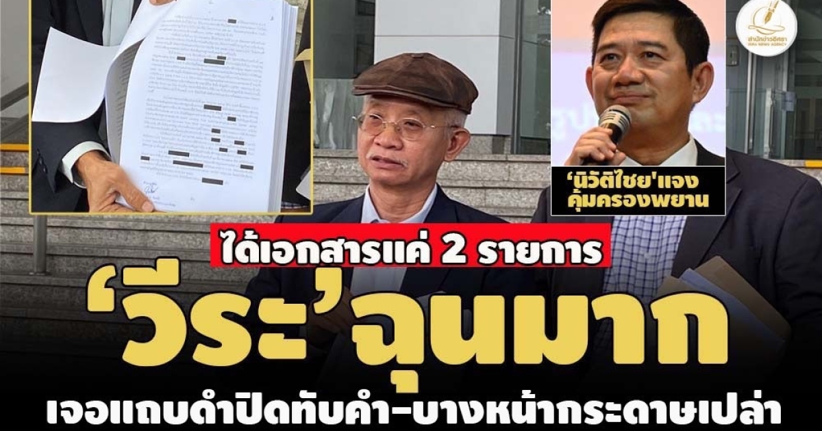 "ส่วนเอกสารรายการที่ 1 และ ที่ 3 ที่ ป.ป.ช. ให้มาเป็นเอกสารที่มีแถบดำปิดคำบางส่วนเกือบทุกหน้า บางหน้าปิดทั้งข้อความ โดย ป.ป.ช. อ้างว่า ปกปิดชื่อพยาน และมีบางหน้าเป็นหน้าเปล่า ศาลไม่ได้สั่งให้ทำเช่นนี้ สิ่งที่ให้ผมในวันนี้ถือว่าไม่ถูกต้อง ไม่ครบถ้วน" นายวีระกล่าว
